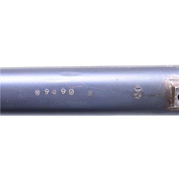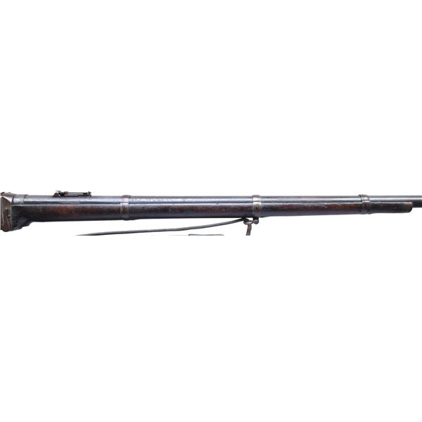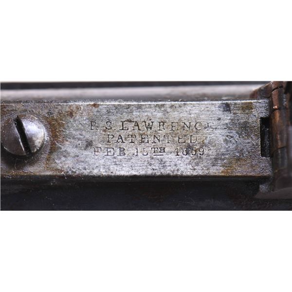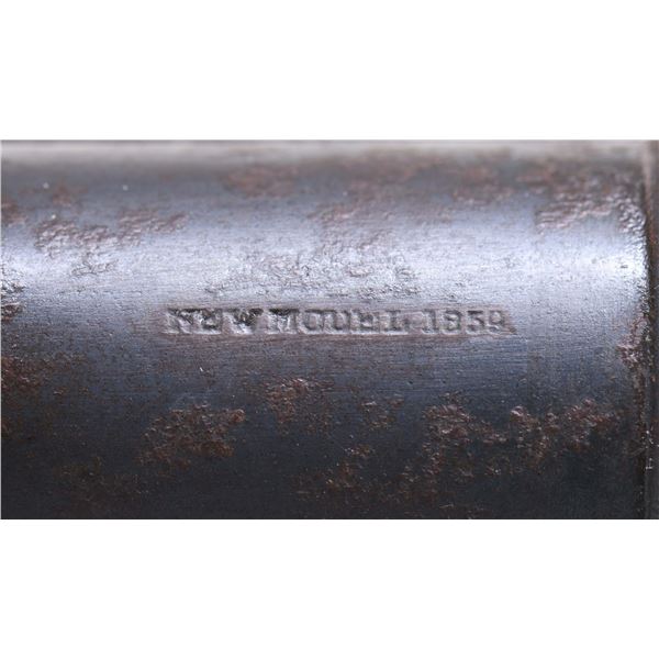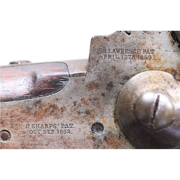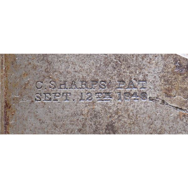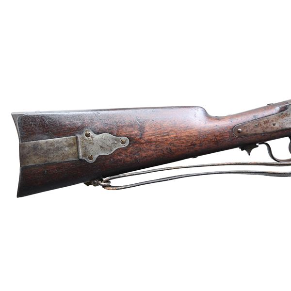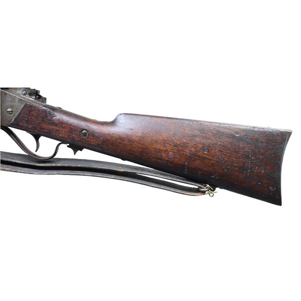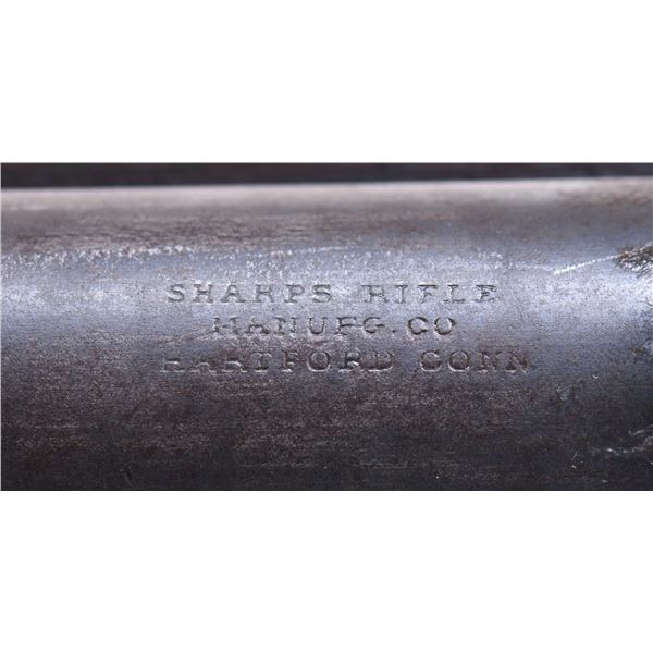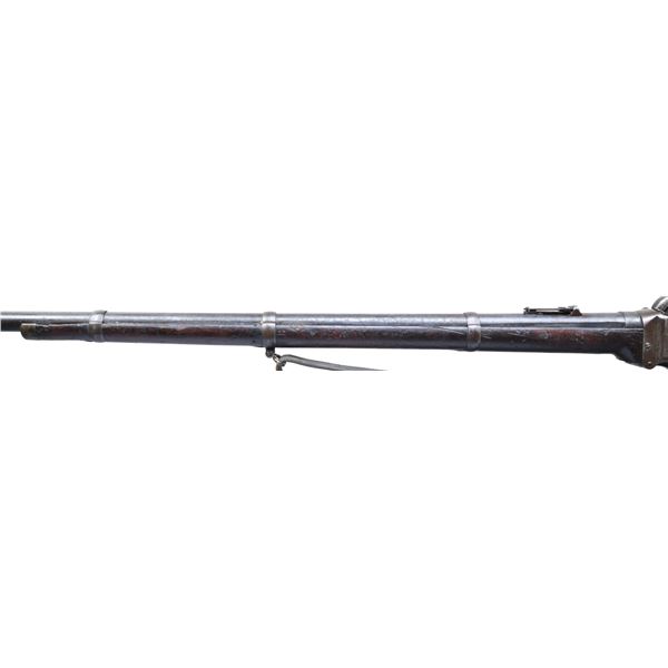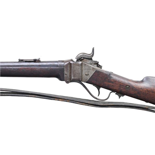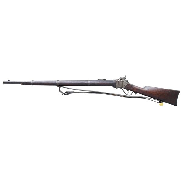 RIFLE IN BERDAN SERIAL RANGE. Cal. 52. S# 57476. 2000 rifles were originally ordered by Hiram Berdan for his 1st & 2nd U.S. Sharpshooters, and made them famous. The known serial range for Berdan rifles is 54374-57574 (known highest & lowest serial numbers as noted by authority Wiley Sword). This gun conforms to standard configuration ordered by Berdan with 30" six land & groove rifled barrels, no bayonet lug, made to fit angular bayonet. An unusual marking on bottom of barrel is stamped small federal eagle, noted on one other rifle in the same serial range. Its significance is unknown. This fine survivor does not have double set triggers and was not inspected by John Taylor (JT) but has final inspection cartouche TWR (Thomas W Russel). The barrel is inspected by SW. Most rifles in this range listed by serial number in National Archives records were issued to the 2nd Veteran Volunteers late in the war. Rifles had been recalled from service from units such as the 42nd Pennsylvania, 190th Pennsylvania and others. Regardless, this rifle was issued and saw service. Sharps rifles were renown for accuracy and soldiers who had them coveted them. UNATTACHED ACCESSORIES: reprint copy of the 600 page 1892 "Berdan's United States Sharp Shooters in the Army of the Potomac 1861-1865". Copies of pages from excellent recent Sharps text by Roy Marcot & co-authors, pertinent to M-1859 rifles. CONDITION: very good overall, complete, matching, and all original. Metal is overall dark gray patina with strong areas of bright blue on barrel with scattered oxidation, 3 line barrel address & "NEW MODEL 1859" markings are crisp, patent markings on frame & lock are also very good and all discernible. Stocks are sound and solid and well fit. "TWR" cartouche opposite lock is discernible. Mechanically fine, crisp bright rifled bore. Accompanying leather sling is sound with iron buckle. (01-26564/JS). $4,000-6,000.