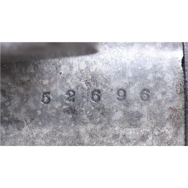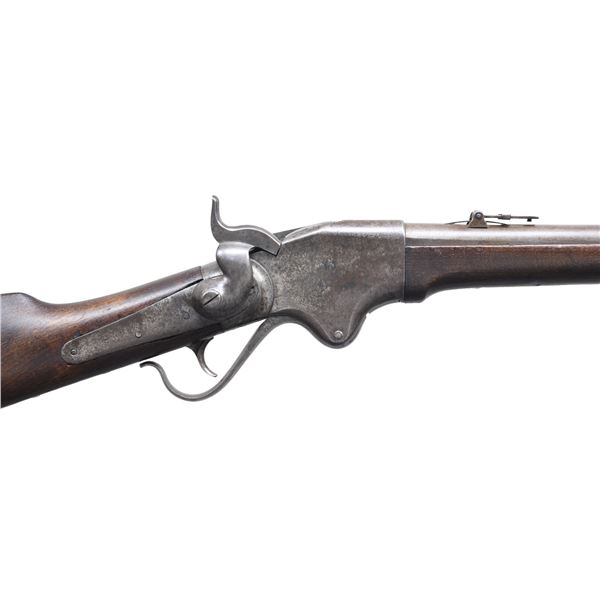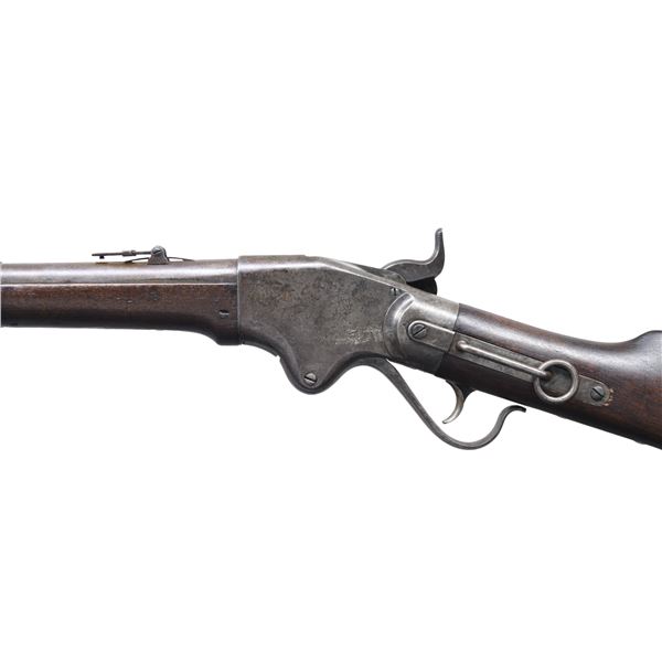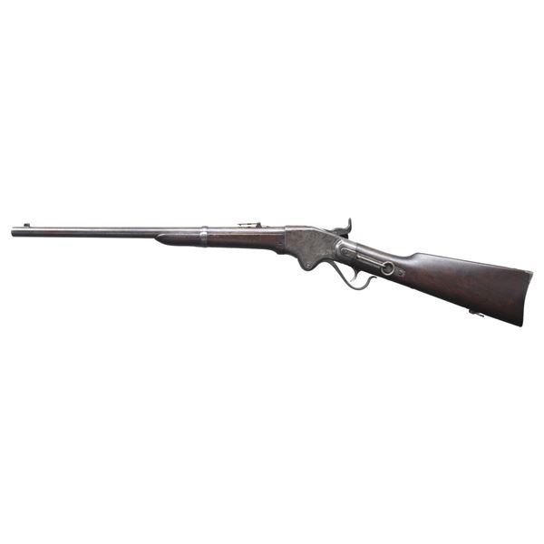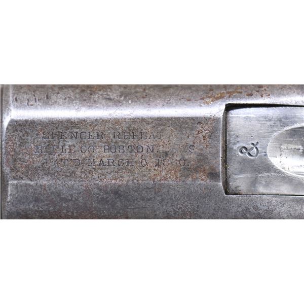 Cal. 56-50 rimfire. S# 52696. Standard configuration of the repeater that changed the Civil War for the Union in firepower, 22" blued round barrel with adjustable ladder rear sight, top of frame has 3-line address: "SPENCER REPEATING / RIFLE CO. BOSTON, MASS / PAT'D MARCH 6, 1860". CONDITION: very good overall, appears all original and complete, maker's mark mostly discerned, metal has mottled smooth grey patina, stock has an early refinish obscuring inspection cartouche. Top of breech has "&" reminiscent of Confederate C&R marks stamped in stocks. Mechanics fine, good bright rifled bore. (01-26835/JS). ANTIQUE. $2,000-3,000.