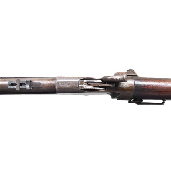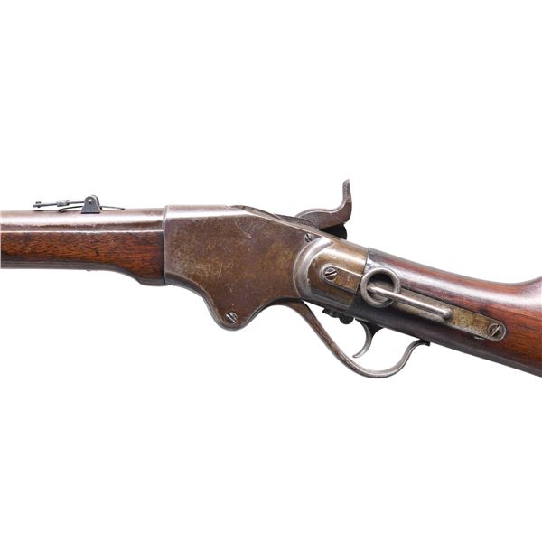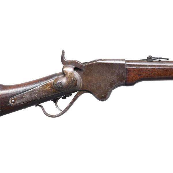 Cal. .50. S# 21815. Standard configuration of model 1865 saddle ring carbine, 20" barrel, manufactured with the stabler cut off device. 30,000 of these carbines were manufactured by Burnside Rifle company 1865-1866, most seeing service in the Indian Wars. CONDITION: good to very good overall, complete and original, smooth metal patina, crisp markings, stock has been sanded & refinished, hairline crack on left side. Mechanically crisp, good 3 land & groove rifled bore. (01-26337/JS). $1,500-2,000.