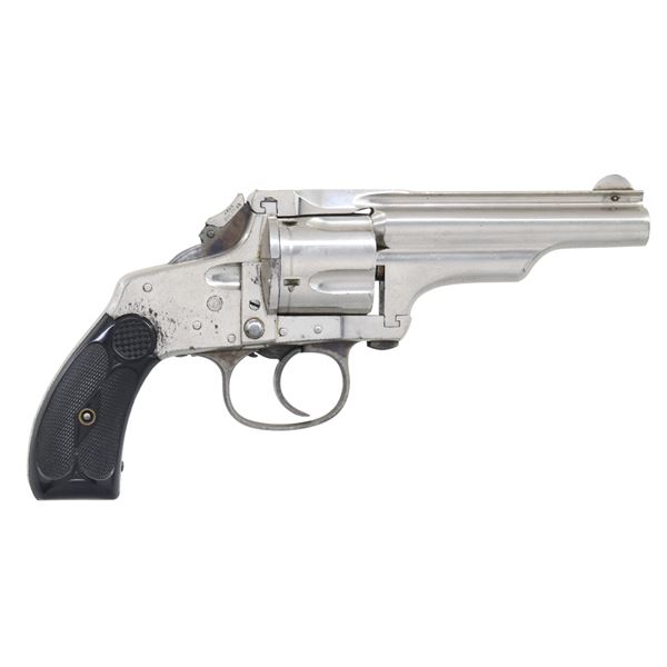 REVOLVER. Cal. 38 Merwin & Hulbert. S# 9304. Mfg. 1880's. Matching numbered 3.5" barrel with pinned blade front sight, Merwin & Hulbert address markings on rib & trench rear sight. Matching numbered 5 shot fluted cyl. Nickel finished with folding hammer spur & 2 piece hard rubber grips. CONDITION: good nickel with light marks & peeling finish in grip areas. Good grips. Very good bore. Appears to mechanically function when cycled by hand. (01-26455/MD). ANTIQUE. $700-1,000.