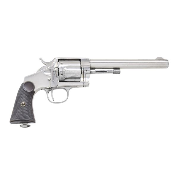 REVOLVER. Cal. 44 RF (44 Henry RF). S# 164 (under grips). Consignor states revolver was imported by Australia. Matching numbered 6.5" barrel. Fixed sights. 6 Shot fluted cyl. Cyl. pin acts as ejector by activating lever on left side. Sliding loading gate. Lanyard ring at butt. Matching two piece hard rubber grips. CONDITION: fair renickeled finish showing worn & peeling finish throughout with scattered peppery oxidation. Good grips with large piece missing from bottom left panel & couple of small cracks on back of panels. Cyl. can be turned loose from safety notch when at full cock, appears to cycle properly by hand. Bore shows deep pitting throughout & intact rifling. (01-26454/MD). ANTIQUE. $500-1500.