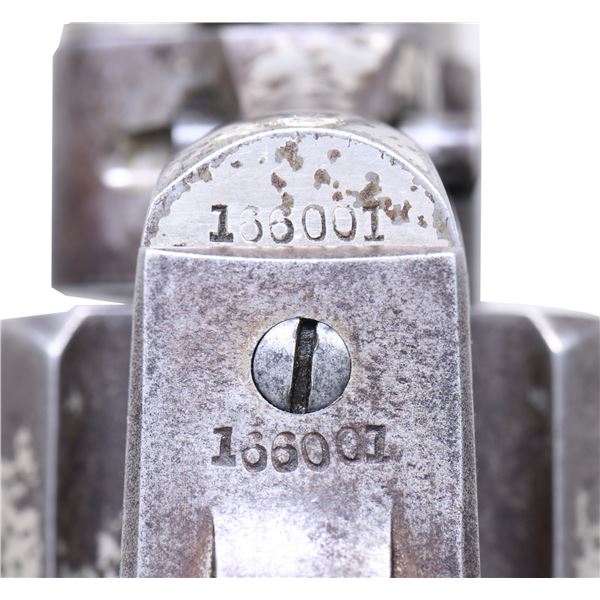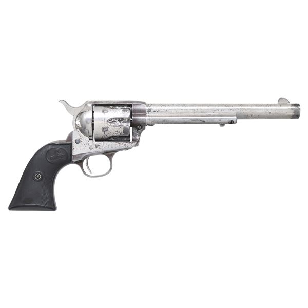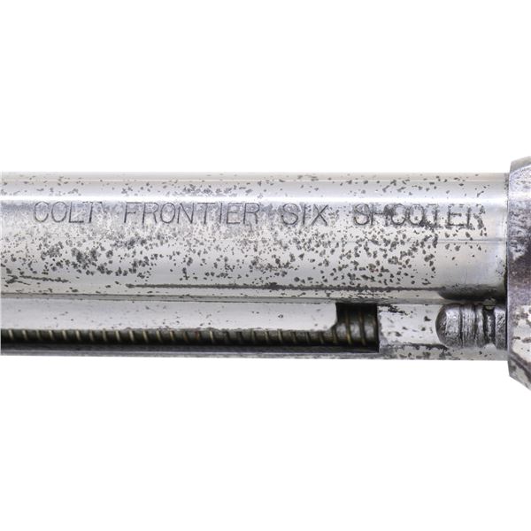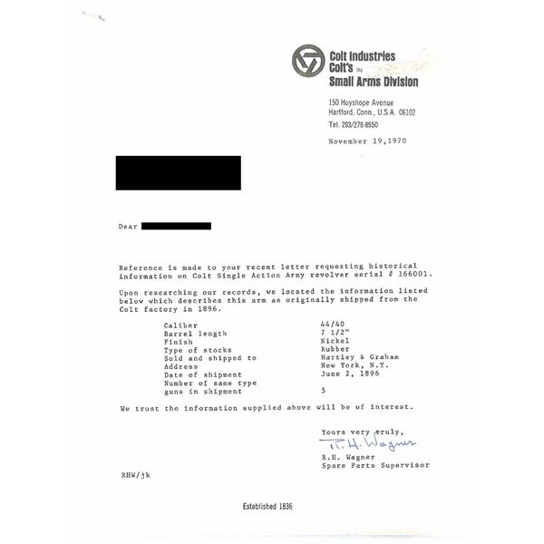 REVOLVER WITH FACTORY LETTER. Cal. 44-40. S# 166001. Bbl. 7 1/2". First year production of Colt's new "smokeless frame" style as evidenced by the spring loaded cyl base pin latch rather than the original transverse retaining screw. Subject revolver falls within a small transitional range wherein features of the "black powder frame" are still present. This revolver still retains the small, original black powder front sight and narrow land rifling appropriate for accuracy with black powder loads, is not guaranteed for smokeless powder and has no verified "VP" mark on the trigger guard. Revolver features a nickel finish with blued screws and cyl. pin latch. Matching numbers on frame, butt & trigger guard, Left side of bbl. roll stamped "COLT FRONTIER SIX SHOOTER". Bottom of bbl. marked with small "44". 2 Piece checkered hard rubber Rampant Colt grips. UNATTACHED ACCESSORIES: Caliber 44/40 / Barrel length 7 1/2" / Finish Nickel / Type of stocks Rubber / Sold and shipped to Hartley & Graham / Address New York, N.Y. / Date of shipment June 2, 1896 / Number of same type guns in shipment 5". CONDITION: metal surfaces retain approx 50% original nickel, notable flaking toward front of frame, front of cyl., muzzle & grip straps. Screw heads remain crisp. Slight marring of cyl. pin head. Good plus grips are lightly worn & beginning to brown with age. Bore has a frosted appearance with strong rifling & scattered areas of light oxidation. Mechanically fine; all 4 clicks present. (01-26982/BH). ANTIQUE. $3,500-5,000