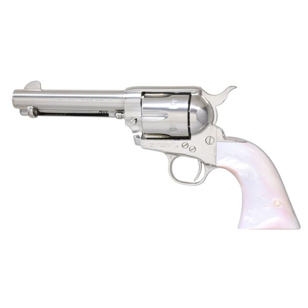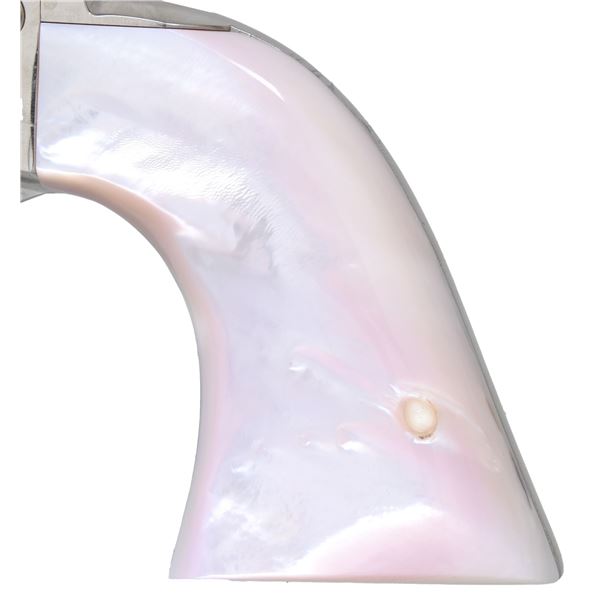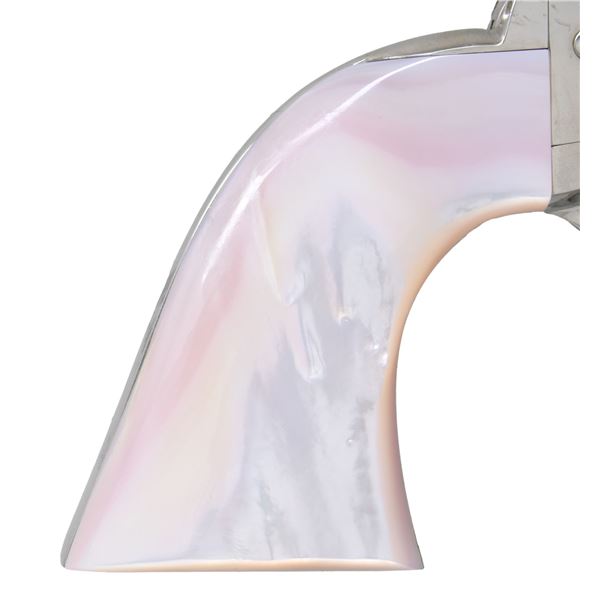 PEARL GRIPS & ORIGINAL BOX. Cal 45 Colt. S# 55564SA. Mfg. 1970. Bbl. 4 3/4" with blade front sight. 6 Shot fluted cyl. Metal parts feature a full nickel finish. Fancy 1 piece pink hued mother of pearl grips. Consignor states that these grips are practically unobtainable at this time due to the difficulty and danger in harvesting this particular mollusk. UNATTACHED ACCESSORIES: matching original factory wood grain box containing original paperwork. 2 Piece hardwood grips with Colt medallions. CONDITION: very good to near excellent with a few very fine finish scratches on right rear of frame. No cyl. drag line present. Currently installed grips near excellent; slightly oversized and a little loose. Mint bore; appears unfired. (25-1514/BH). CURIO. $2,500-3,500.
