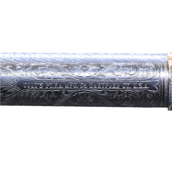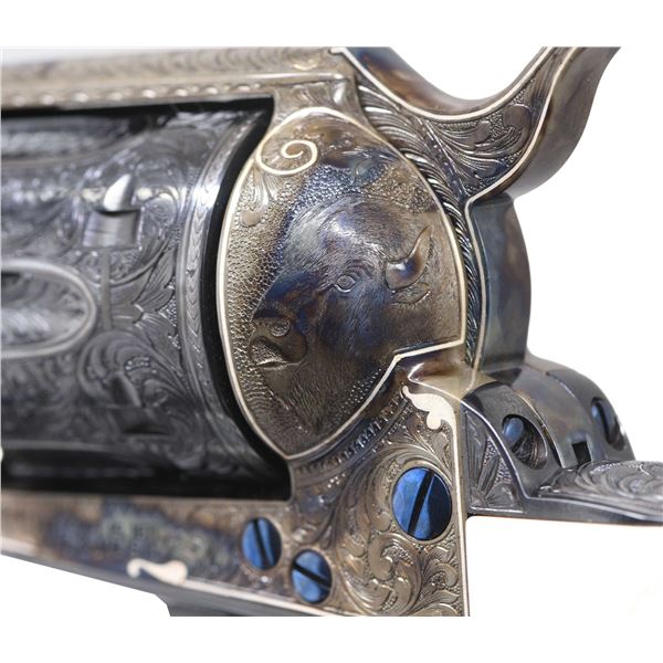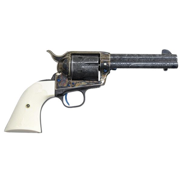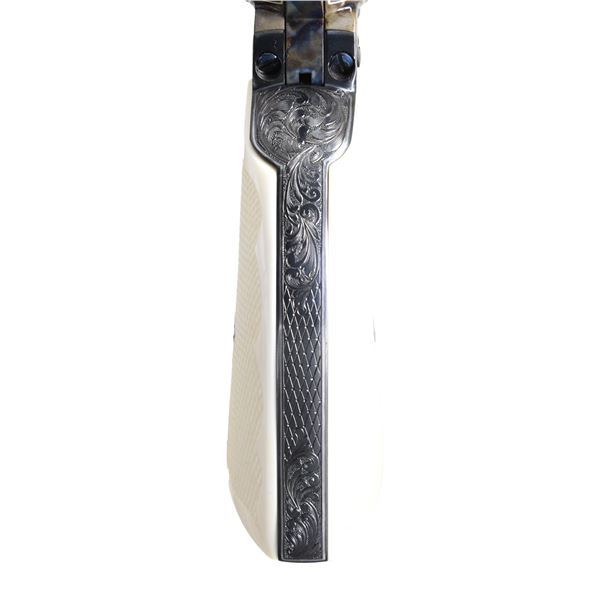 HURST. Cal. 45 Colt. S# SA60603. Bbl. 4 3/4" with engraved burst of arrows design plus contrasting metal band inlays at muzzle & chamber end. Mfg. 1982 and later engraved by Master engraver Ken Hurst. Revolver features full coverage scroll & feather engraving with punch dot background & fancy borders. Rear edge of cyl. & cyl. flutes outlined in a contrasting gray metal inlay. Contours of frame & hammer display straight line & leaf type silver or platinum inlay. Recoil shield on left side of frame engraved with buffalo head. Blued bbl. cyl & grip frame. Case colored frame & hammer. Nitre blued small parts include ejector rod head, cyl pin, latch & action screws. Engraver's signature K. KURST appears on frame above S#. 2 Piece checkered antique ivory grips. UNATTACHED ACCESSORIES: 2 piece checkered hard rubber eagle grips. CONDITION: all aspects near excellent; appears new & unfired since time of custom engraving. (25-1515/BH). MODERN. $5,500-8,500