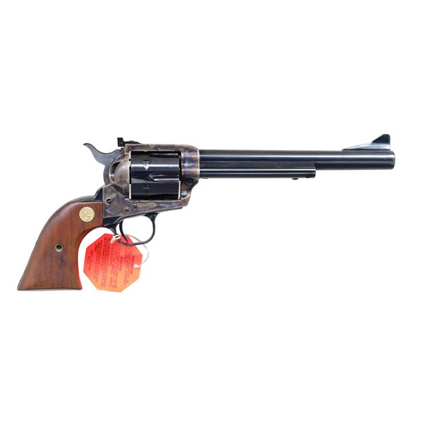 ARMY .44 SPECIAL FLAT TOP TARGET REVOLVER WITH MATCHING FACTORY BOX. Cal. 44 Special. S# 06003NF. Bbl. 7 1/2". New Frontier Single Action Army flat top target revolver mfg. by Colt, circa. 1970. The left side of the bbl. is marked "COLT NEW FRONTIER S.A.A. .44 SPECIAL", with Colt's single line address marked across the top. Left side of the frame is marked with Colt's patent information, followed by the Rampant Colt logo. Frame exhibits a case color hardened finish, with remaining metal components exhibiting a blue finish overall. Frame is mounted with 2-piece Colt gold medallion smooth wood grips. Serrated ramped blade front sight, with adj. square notch rear sight. Matching numbers are present on the frame and cyl., with the grip straps being numbered "3490" on the left side, beneath the grip panels. Grips are matching via "6003" in pencil on the interior of the panels. UNATTACHED ACCESSORIES: factory box, with matching S# handwritten on end label. CONDITION: very good, with metal components retaining the majority of their original factory finishes, exhibiting scattered spots of mild surface oxidation, with small areas of light to mild pitting also present on the frame. Mirror bore, exhibiting well defined rifling throughout. Grips are very good, showing a few light superficial handling marks. Box shows exterior wear, as well as some tearing from handling and storage, but otherwise remains serviceable. (25-1231/MLW). MODERN. $1,000-2,000.