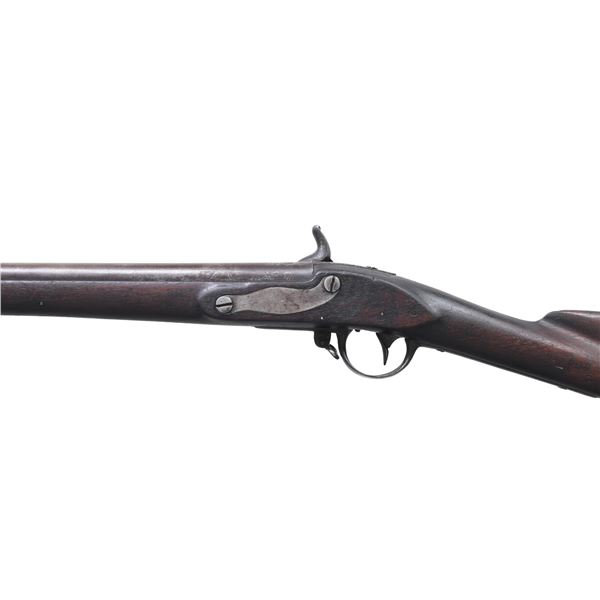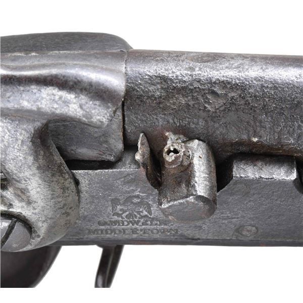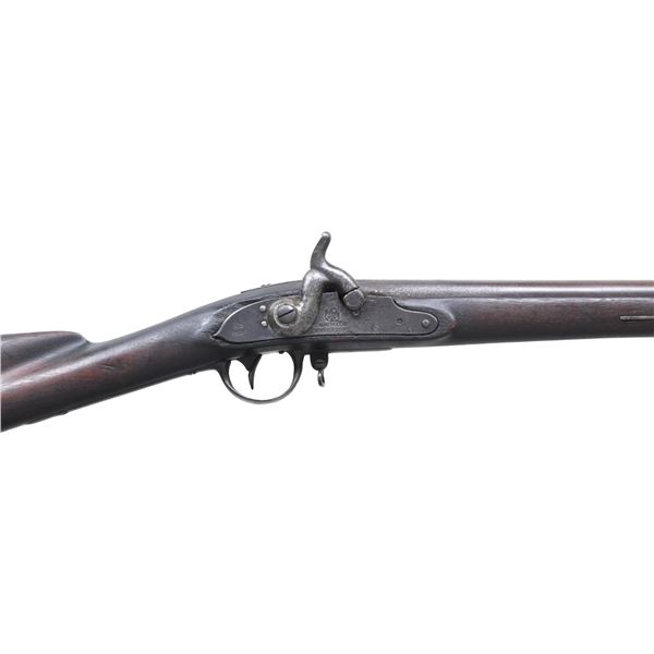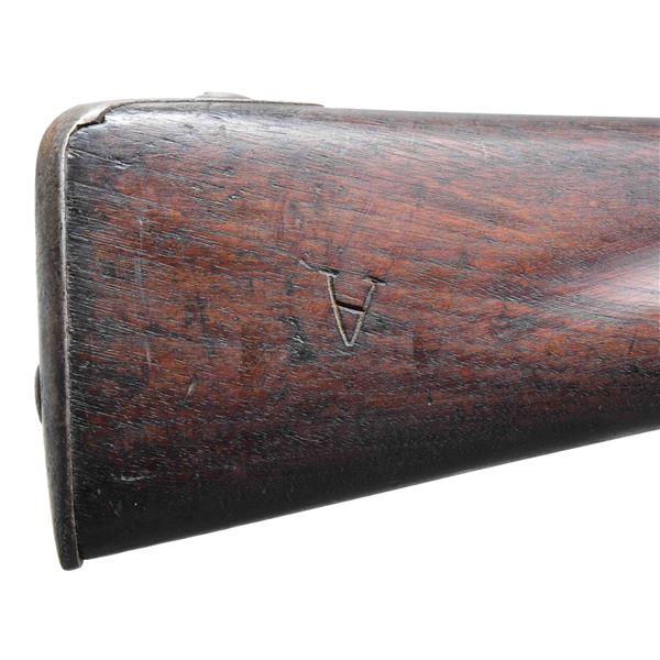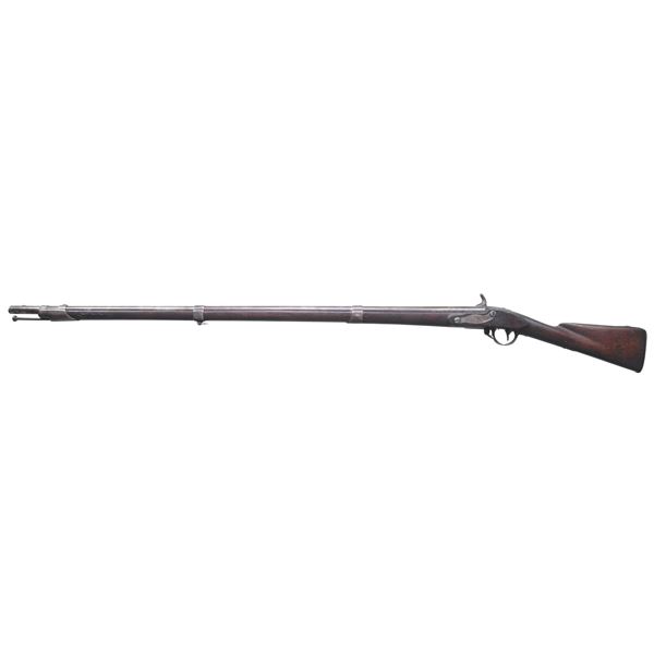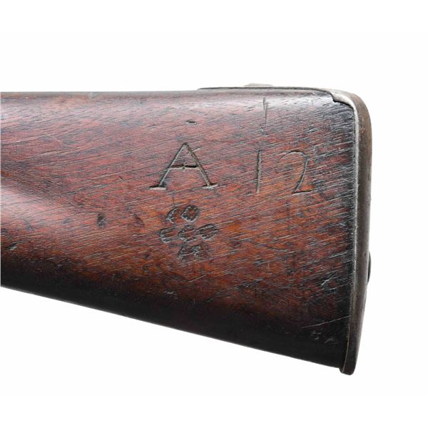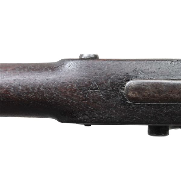 BIDWELL CONVERTED TO PERCUSSION. Cal. 69. NSN Bbl. 44 1/4". The round bbl has a lug front sight and is marked near the breech "US / (eagle head) / V". The rear of the lock is marked "US 1811" and under the hammer is marked "(eagle) O.BIDWELL MIDDLETOWN". The lock shows a well-executed barrel conversion but the nipple is broken off. Iron trigger guard, buttplate, sideplate, bbl bands, nosecap, sling swivels, and ramrod. Walnut stock with an "A" carved into the right cheek and another carved in front of the trigger guard. The left cheek has a carved "A" with "12" and seven circular punches below. CONDITION: iron generally has a gray/brown patina with minimal pitting and a few vice marks near the breech. Lock holds both full and half cock. Stock shows no serious flaws. Fair but dirty bore. (01-26865/BF). ANTIQUE. $600-900.