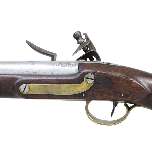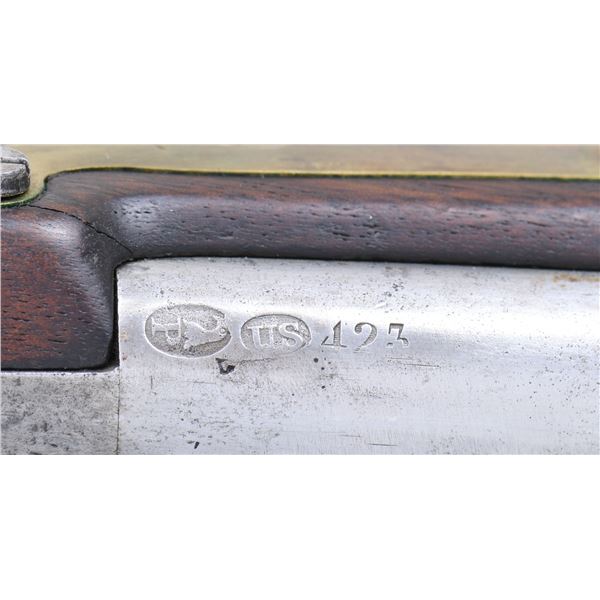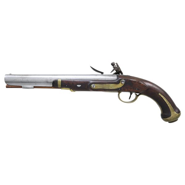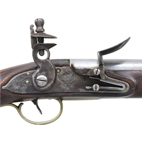 Cal. 54. S# 423. Always considered among the most beautiful and aesthetically pleasing of American martial pistols, the 1805 is the logo gun of the American Society of Arms Collectors. These guns were made in pairs between 1806 and 1808 with a total production of about 4,000 guns with each gun of a pair having same serial number. This gun is in the normal configuration of other guns in this pattern with 10" round barrel, breech marked with raised eagle over "P" in a sunken oval behind a raised "US" in a sunken oval behind stamped S# 423. Lock is marked "HARPERS / FERRY / 1807" in vertical arcs behind cock. Under the pan is a spread winged eagle facing toward the cock over "US". The wood opposite the lock is marked with script inspector initials "V" over "CW" (inspector Charles Williams). This a pleasing example from old Massachusetts collection. CONDITION: good to very good overall, good markings, barrel cleaned to bright. Well done reconversion from percussion back to flint, stock has well done crack repair at wrist, hairline forward of trigger guard. All original with exception of battery components from reconversion and new wood ramrod. Mechanics are sound, smooth clear bore. PROVENANCE: White's Auction, Attleboro, Mass, October 6, 2001, lot 212. (01-26599/JS). $5,000-7,000.