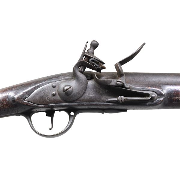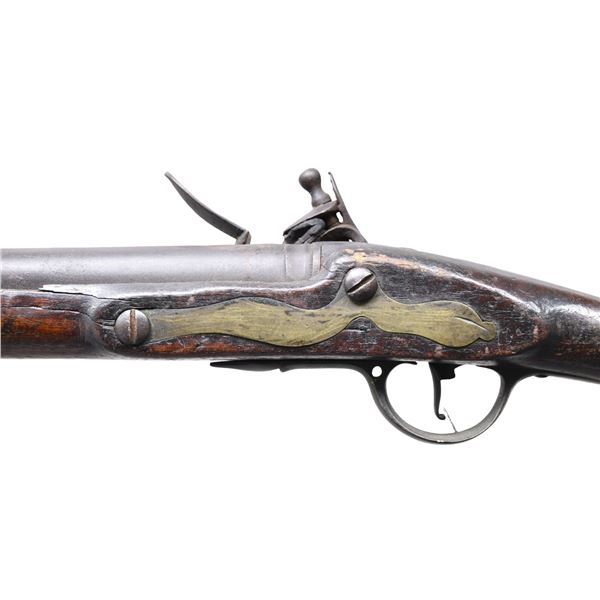 MARKED DUBLIN CASTLE. Cal. 80. NSN. Bbl. 42 1/8". The barrel has a small lug sight near the muzzle and two incised bands at the bolster. There are proof marks on the top of the barrel that are barely legible. The lock has a crowned "GR" in front of the cock and "DUBLIN CASTLE" to the rear of the cock. Brass trigger guard plate, flat sideplate, entry thimble, ramrod thimbles, and nose cap. Iron ramrod. Original heavy wood stock. CONDITION: all iron parts have a very dark aging patina. The lock functions well and holds both full and half cock. Brass has a deep brown patina. The stock has numerous dents and dings with periodic losses around the barrel channel. The front 2 1/2" of the stock has a spliced repair and there are 2 tight cracks emanating from the front sideplate to the barrel channel. Fair bore, would benefit from a vigorous cleaning. (01-26170/BF). ANTIQUE. $4,000-6,000.