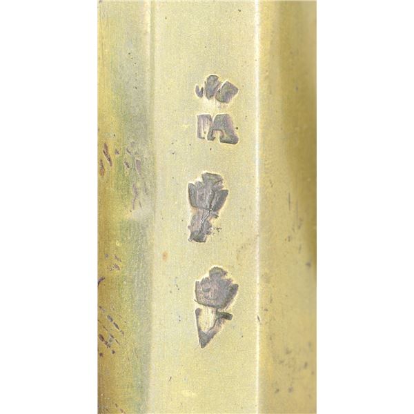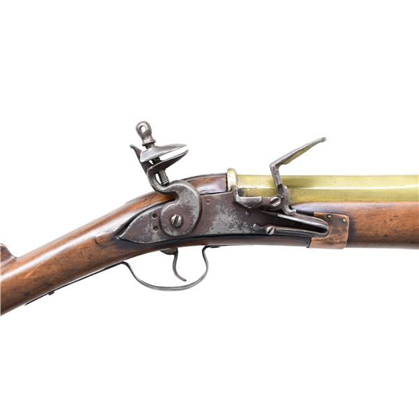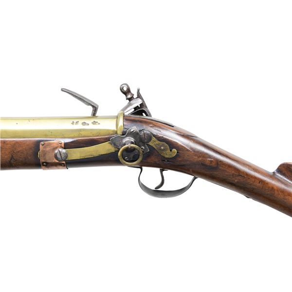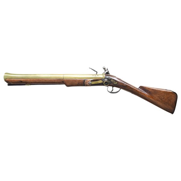 BLUNDERBUSS. Cal. 80. NSN. 33.5" overall, 19" tapered 2 stage octagonal to round barrel flaring to 1.6" at muzzle, commercial London proofs. Simple early iron furniture other than long brass sideplate, curved early "GILL / LONDON" lock with flat serpentine cock, full pinned stock with single ramrod thimble, saddle ring added at later date, with 2 old sheet copper repairs. CONDITION: good overall, appears all original to time of use, iron patina, lock markings only partially discernible, later wood ramrod, mechanics sloppy but functional, clear smooth bore. (01-26823/JS). ANTIQUE. $2,000-3,000.
