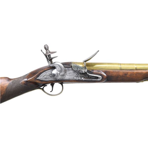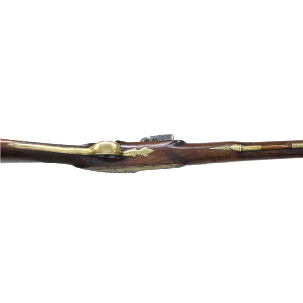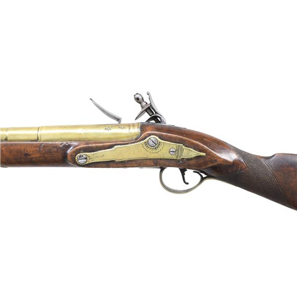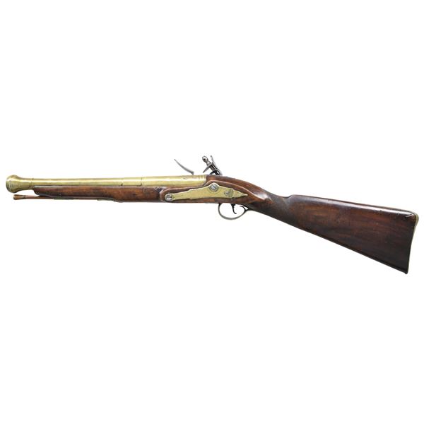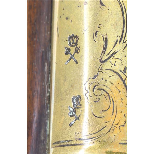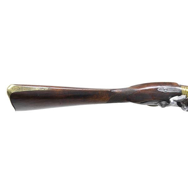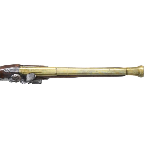 GUN. Cal. 70. NSN. 30.5" overall, 15.25" tapered 4 stage round barrel flaring to 1" cannon muzzle, engraved "LONDON", commercial London proofs, lock signed "KING", brass furniture, checkered pinned walnut stock with two ramrod thimbles. CONDITION: good to very good overall, appears all original and complete, old cleaning brass & iron toned patinas, stock sound with varnish, barrel has verdigris around touch hole. Mechanics fine, clear smooth bore. (01-26825/JS). ANTIQUE. $2,000-3,000.