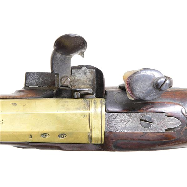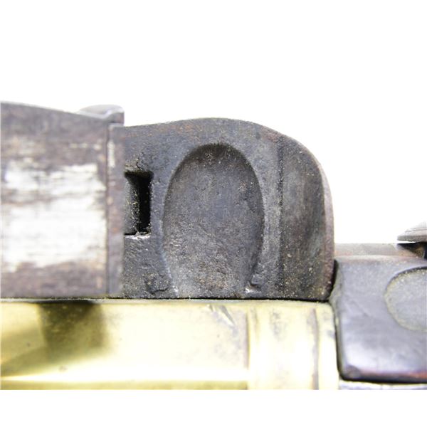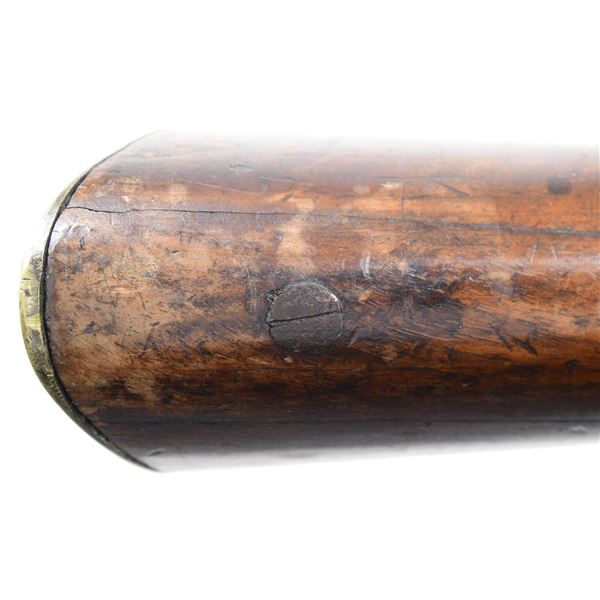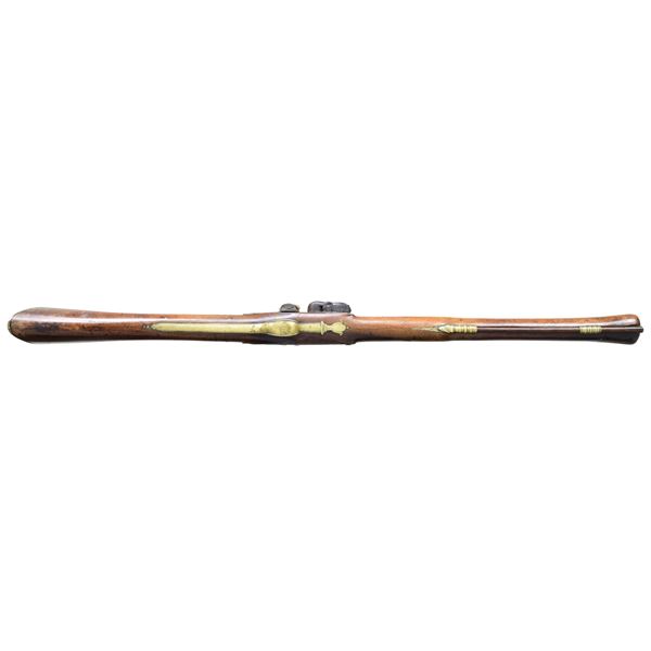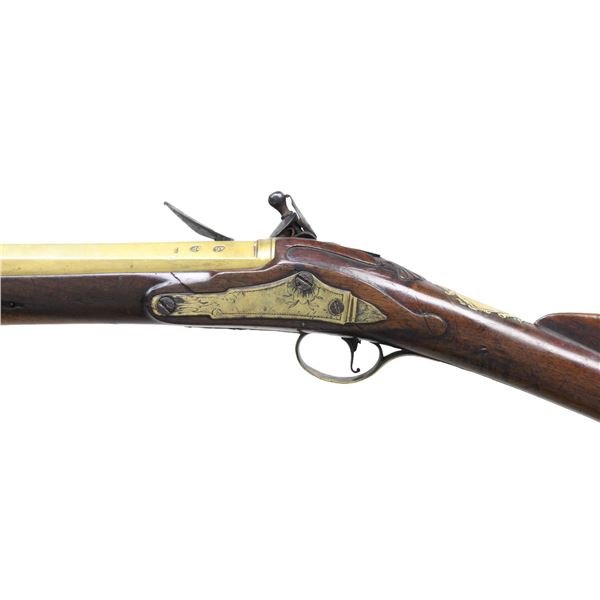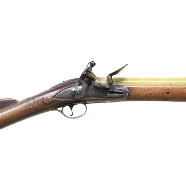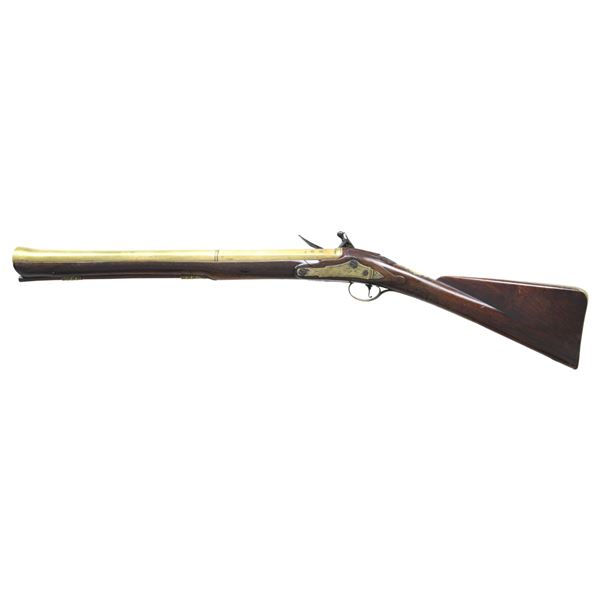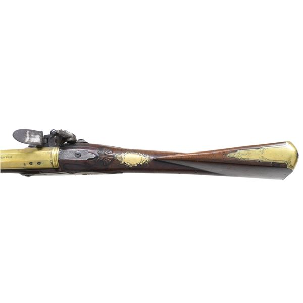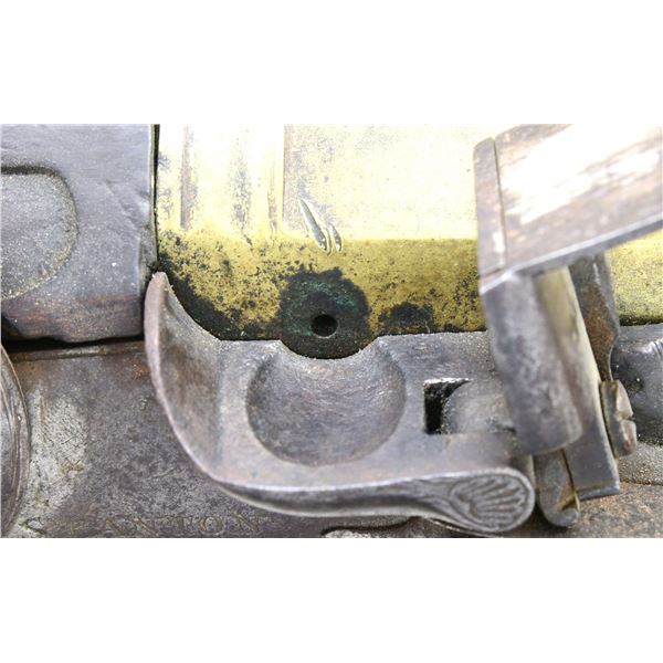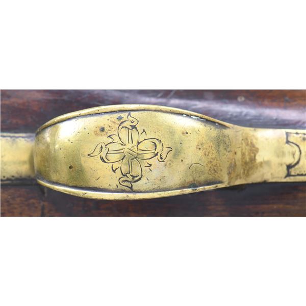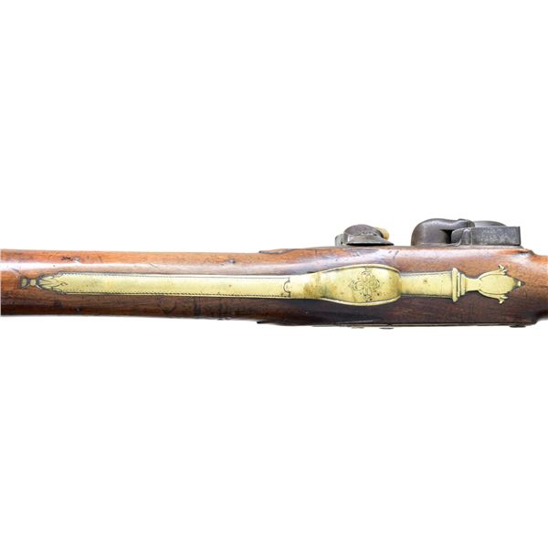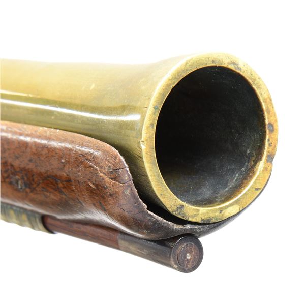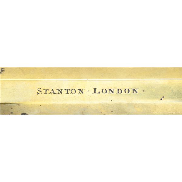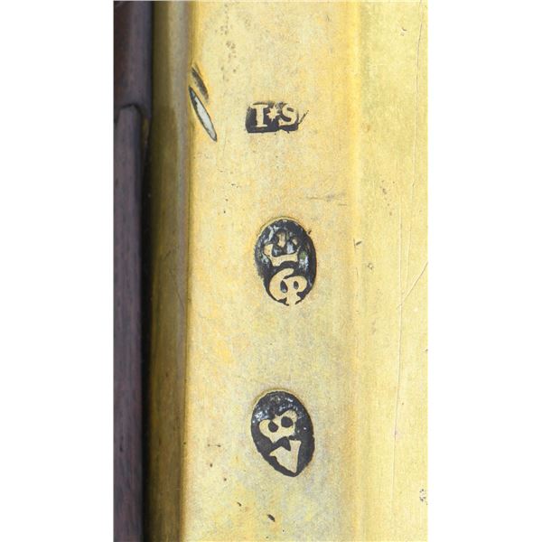 Cal. .85. NSN. 34" overall, 20" brass barrel flaring to about 1.5", maker marked "STANTON LONDON" on top with commercial London proofs on breech, and "IS" for Jonathan Stanton who worked 1748-1765, he died in 1766. Lock is nicely beveled, engraved "STANTON", beveled serpentine cock, bridled frizzen, and integral curved steel pan. Brass furniture is sparsely engraved en suite. Full length stock has raised moldings. CONDITION: very good overall, brass has toned patina, steel is gray, stock is sound with old screw repair at toe, 3" inset repair to stock at muzzle on left side. Mechanics are fine, smooth clear bore. (01-26561/JS). ANTIQUE. $2,500-3,500.