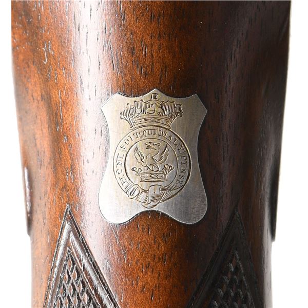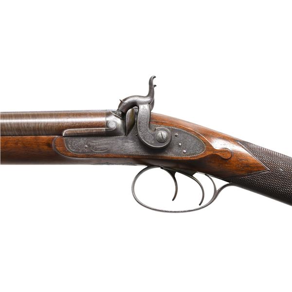 CO. OWNED BY A DUKE. Cal. 16 Bore .667 diameter. S# 4508. The 30" twist barrels have heavy reinforced breech section as seen on many later guns by Joseph Manton and are engraved "Forsyth & Co. No. 8 Leicester St Leicester Sq London" on raised concave rib. Bottoms of barrels are stamped with S#, proofs and barrel maker's initials "TP". Breech plugs are well filed, have matching numbers and vented platinum blowouts. Gun is number 2 of a pair with "2" engraved on rib and stamped in barrel channels. Breech iron is engraved with very well shaded scroll and a game bird. Front spring locks with flat faced serpentine hammers having dolphin heads are engraved with large open scroll and game scenes; running rabbit on left and game birds on right. Trigger plate has stylized pineapple finial. Trigger guard with dog on bow has S# on tang. Dense stump figured European walnut straight grip buttstock measures 14-3/4" over iron buttplate with dog and bird engraved long top tang. Squarish checkering is at grip and a silver shield at top of grip is engraved with a crest depicting crowned order of the garter belt surrounding arms of a phoenix emerging from a Duke's crown. Stock attaches to barrels with captive side nail through oval silver escutcheons. Ebony ramrod with brass tip and tail (worm under cap) mounts through two plain pipes and scroll engraved thimble in stylized pineapple form. MEASUREMENTS: BBLS: Bore Diameter: L .667. R .667. Wall thickness: L .026. R .024. STOCK: DAH: 2". DAC: 1-7/16". CAST: about 1/2" off. LOP: 14-3/4". WEIGHT: 6 lb. 12 oz. CONDITION: good as partially refinished. Barrels retaining about 85% of an old re-brown over some scattered pitting with some subsequent wear and cleaning. Engraving of name considerably softened. Locks are dark gray and smooth showing traces of case hardening color where protected. Trigger guard shows considerable pitting on bow. Stock retains what appears to be its original oil finish with a scattering of marks and dings. Checkering is lightly worn. Bores are fairly smooth toward breech ends, pitted toward muzzles. Locks are fine. A very high quality gun by a famous maker. (01-25796/MGM). ANTIQUE. $1,500-2,500.