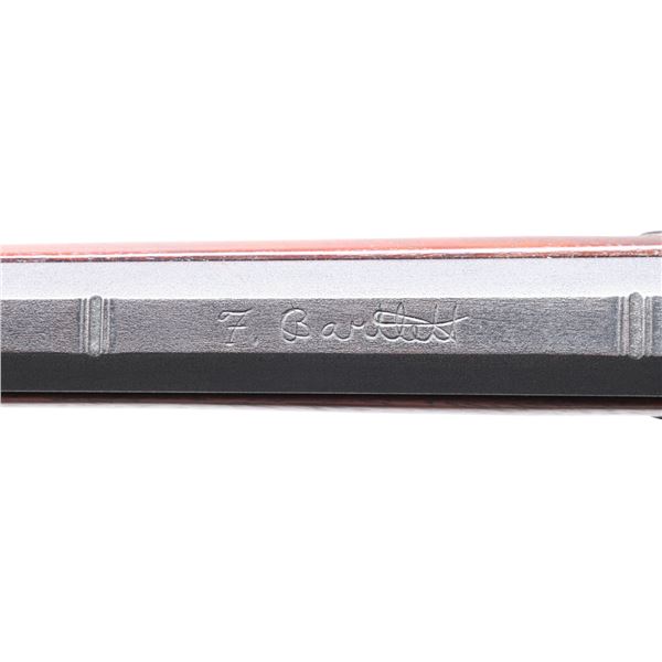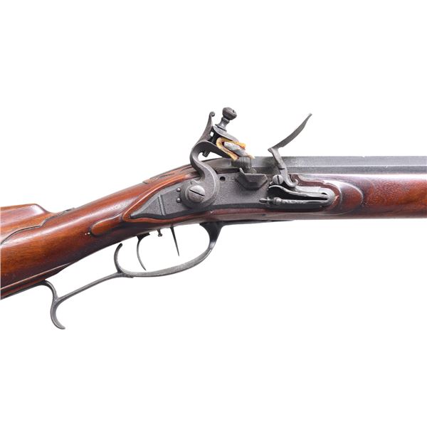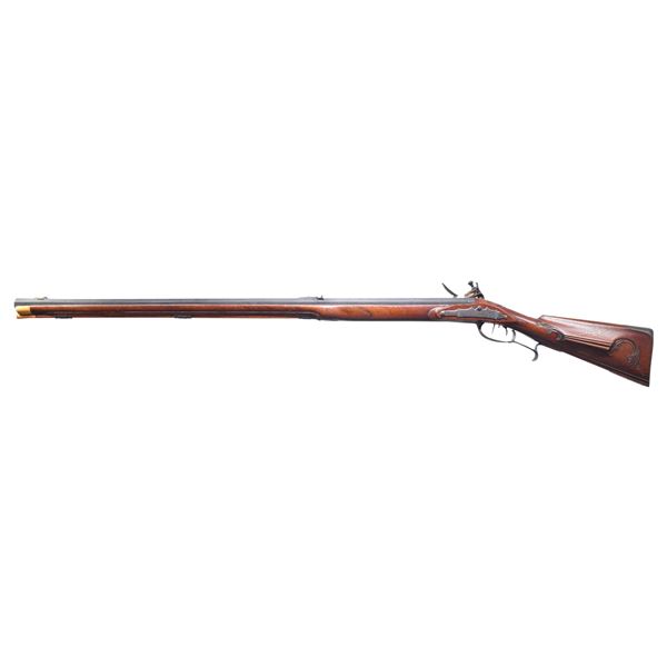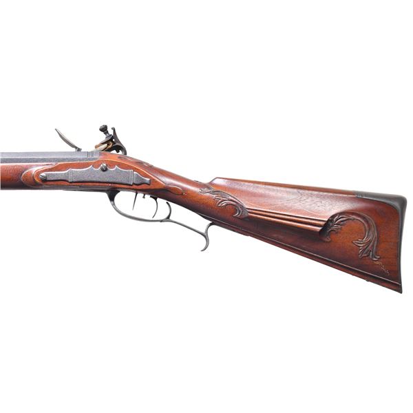 RIFLE WITH RAISED CARVED DECORATION AND SILVER WIRE INLAY BY F. BARTLETT. Cal. 50. S# NSN. Frank Bartlett of Gallatin, TN specialized in transitional German Jaeger to American Kentucky long rifles. His work is highly regarded, especially his wire inlay. This nicely made rifle of early design has 37" swamped octagon barrel fitted with standing leaf rear and long silver bead front sights. "F. Bartlett" is engraved in script on top flat. Touch hole is bushed. Early style lock with deeply curved chamfered plate and rebated tail is fitted with serpentine cock, inset faceted pan, unbridled friction frizzen and file decorated feather spring with fleur-de-lis finial. Triggers are double set. Early style iron trigger guard has spur toward rear forming pistol grip. Rifle is iron mounted with broad buttplate, long file decorated sideplate and fancy turned ramrod pipes and thimble. Walnut full length stock with bone forend tip has well carved mouldings around lock, barrel tang and sideplate. Fluted cheekpiece is flanked by relief carved acanthus scroll. Mouldings are also present along toeline and ramrod channel. A patchbox with sliding wooden cover is on right side of butt. Simple silver wire inlay can be found on face of cheekpiece and outlining raised carving on right side of comb. Silver dots are behind drop points. CONDITION: exceptionally fine. Possibly unfired. Metal retaining nearly all deeply rusted dark brown (antique) finish. Stock retains essentially all of its original oil finish with only a few scattered marks. Bore is bright and shiny throughout. Mechanically fine. (01-26208/MGM). ANTIQUE. $2,000-3,500.