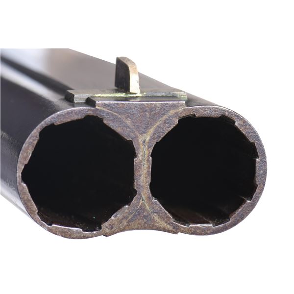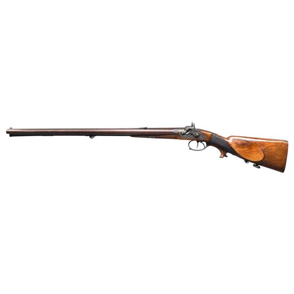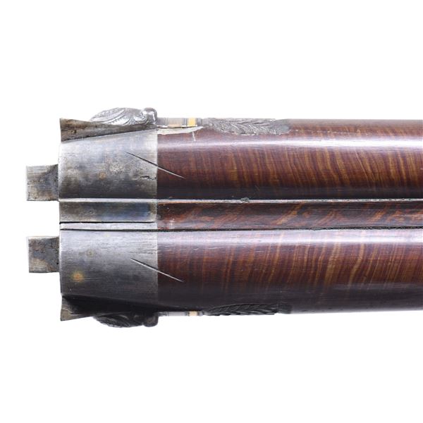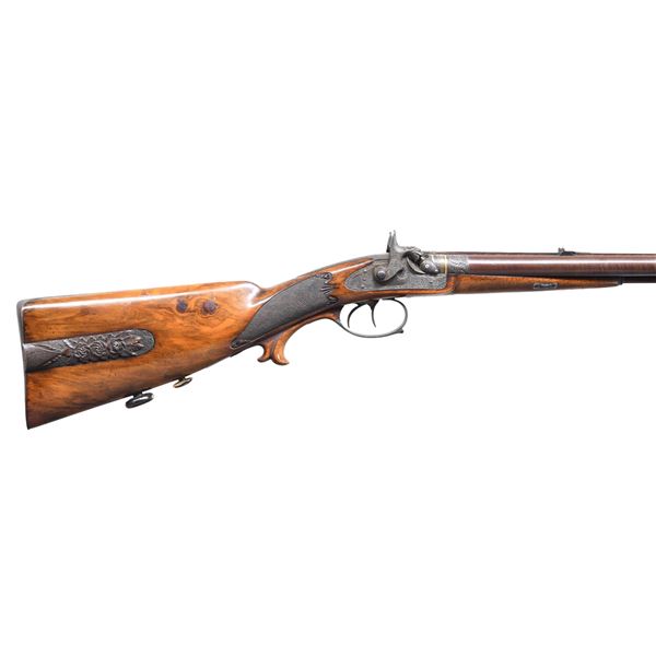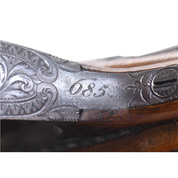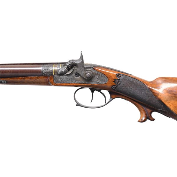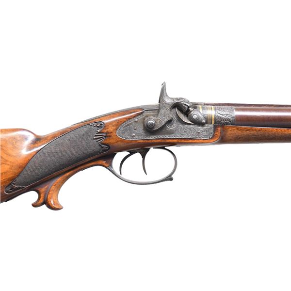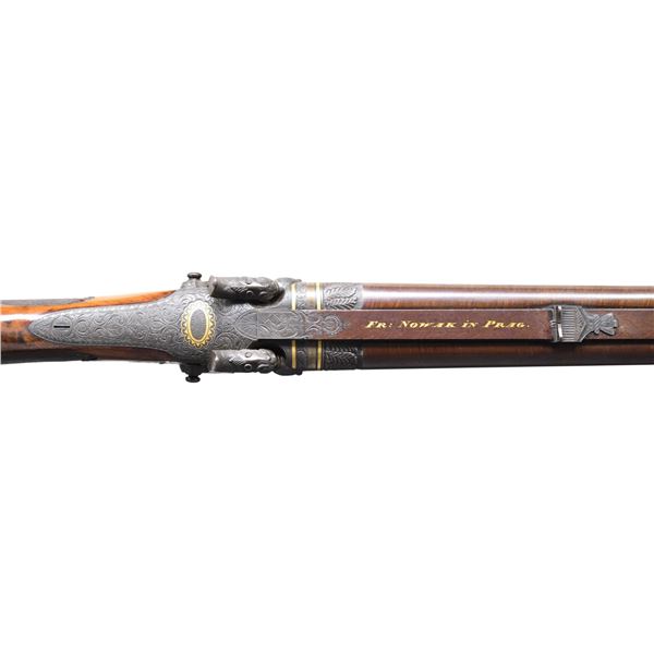 FRANZ NOWAK OF PRAGUE. Cal. 62. S# 685. Exhibiting the fine workmanship normally expected from Bohemian gunmakers. This rifle has 27" twist barrels gold inlaid "Fr: Nowak in Prag." on broad full length rib with single standing rear sight. Breech ends of barrels are relief carved with a band of fern leaves and have gold lines. Breech plugs have vented platinum blow outs and engraving of hunting horn on rib extension. Broad and long breech iron is near fully scroll engraved and gold inlaid with fancy border around engraved maker's name and address. Unusually shaped tall front spring locks with flat faced hammers having relief carved wolfs heads are scroll engraved at fronts. Game scenes are on tails, with recumbent deer on left lockplate and sitting hound on right. Front trigger is set. Trigger plate has shell engraved pineapple finial. Trigger guard with filed in lip at front is engraved with Russian boar on bow. S# is on transition from bow to scroll carved wooden grip. Somewhat figured European walnut straight grip stock measures 14" over steel buttplate with long top strap engraved with scrolls and a sleeping stag. Stock features low swept right hand cheekpiece, a steel sling button along with a large horn button are on toeline. Wooden patchbox with sliding cover is carved with roses. Depressing center of front rose releases latch. Inset checkering at grip is very closely spaced and has relief carved corners. A small silver rectangle in front of trigger plate is engraved "D" (?). Stock attaches to barrels with captive sidebolt through rectangular engraved silver escutcheons. Hickory ramrod with horn tip has steel tail (worm under brass cap) and mounts through two plain pipes and thimble matching trigger plate. A wide sling loop is attached to rear pipe. CONDITION: very fine. Barrels retaining nearly all of their original brown with some scattered flecking. Other metal parts retain over 90% original dark case hardening color. Stock retains nearly all of its French polish finish with some light marks. Bores are exceptional, bright and shiny. Right barrel rifling has twist; left barrel is straight. Locks are crisp although a bit gummy form congealed oil, need cleaning. Front trigger will set. (01-26471/MGM). ANTIQUE. $5,000-7,000.