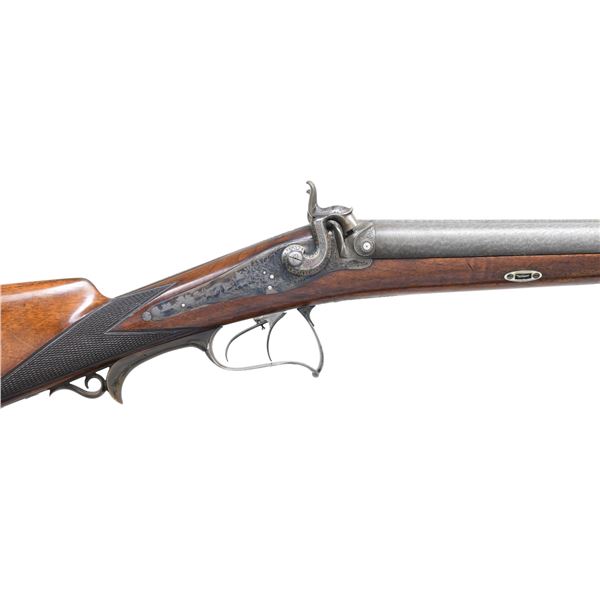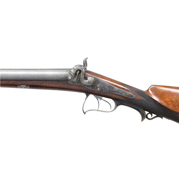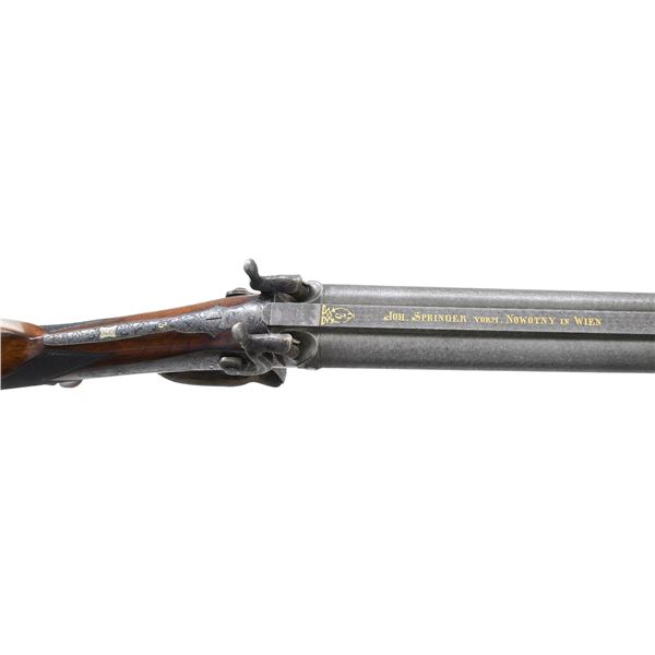 SPRINGER. Cal. 16 Bore. S# 1307 (bottoms of barrels & breech iron). The 25" etched damascus barrels are fitted with slightly raised flat rib sighted with one standing leaf "V" notch rear and silver bead front. Barrel is gold inlaid "Joh. Springer" "vorm. Nowotny in Wien". The number "3" is also in gold at rear of rib. Patent breeches are nicely filed and have vented platinum blowouts. A scene of standing stag is on rib extension. Case hardened breech iron is engraved with very nicely cut and shaded acanthus with scene of a bear, mountains in background. "3" is also gold inlaid and there is a silver poincon engraved with a sovereigns crown over the initials "AC". Case hardened back spring locks with tall chamfered serpentine hammers are engraved with scroll and game scenes toward tails; deer on left and hounds taking down a wild boar on right. Right lock is engraved "Springer" under hammer; "in Wien" is on left. Steel trigger guard with deer scene on bow has carved horn grip extension. Both triggers are set. Half stock of crotch figured European walnut measures 13-3/4" over steel buttplate with long top tang; engraved with scroll and a dog scene. Steel patchbox with arrowhead finial is spring loaded. Cover is engraved with three stags in mountain meadow. Stock features swept shadow line cheekpiece and point pattern grip checkering. Stock attaches to barrel with sidebolt through oval silver escutcheons. Mahogany ramrod has brass tip and brass tail and mounts through two plain pipes and scroll engraved thimble. A broad sling loop is attached to rear pipe; sling loop is missing from toeline of stock but a large steel button is present. CONDITION: very fine. Barrels retaining nearly all of their very attractive grayish etched finish. Case hardening colors on other metal remains fine with only a few areas showing some silvering from normal hand wear. Bores are good; a bit dark as they appear to be purposely textured. Locks are crisp. Stock retains nearly all of its French polish finish with a fair scattering of marks and dings with one or two fairly heavy noted on right side of butt. A very presentable early offering from this prestigious firm. (01-26472/MGM). ANTIQUE. $4,500-6,000.