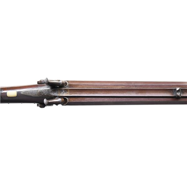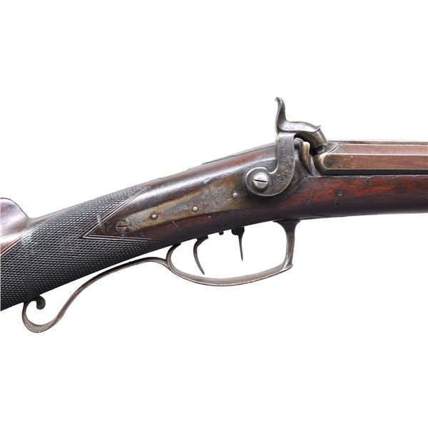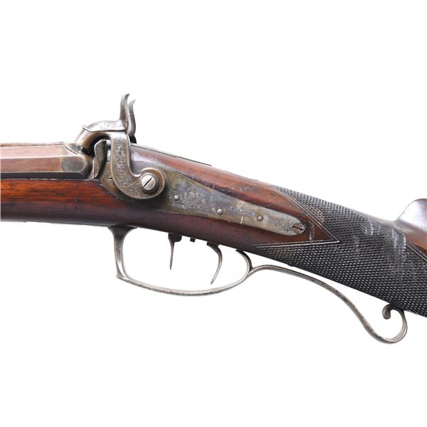 John Krider, born in 1813, apprenticed to Prosper Vallee, well known Philadelphia gunsmith, in 1826. Krider bought Vallee's business in 1839 and began building guns, rifles and pistols under his own name. By 1850 he had over $2,000 invested in his business and employed 10 people. By 1860 his business was worth over $10,000 and he employed 24 hands. Krider made the first prototypes of the famous LeMat revolver. Krider was also an avid ornithologist with a large collection of eggs, nests and study skins housed on the upper floor of his building at the corner of 2nd and Walnut Streets, Philadelphia. He was known for producing good quality weapons at a decent price and his rifles were often the choice of settlers heading west. Cal. 40. S# NSN. The 32" browned octagon barrels are fitted with full buck horn rear and silver blade front sights on concave rib engraved "PHILAD.a". Nicely filed case hardened breech plugs do not have blow outs and are scroll engraved on rib extension. Breech iron is also engraved with nicely cut shaded scroll. Back spring locks with flat faced serpentine hammers are also engraved with scroll and "KRIDER" is stamped on the tail of each plate. Double set triggers are fitted; right lock is fired when triggers are set; left lock trips on second pull of front trigger. Scroll engraved iron trigger guard has scroll at rear forming pistol grip. American walnut stock measures 14-1/8" over shallow crescent buttplate with scroll engraved top tang and 3" return. Stock features swept shadow line right hand cheekpiece, point pattern grip checkering, case hardened and engraved patchbox on right side of butt and a vacant silver rectangle at top of grip. Stock attaches to barrels with sidebolt through shaped and engraved steel escutcheons. Hickory ramrod with silver tip and brass tail with worn mounts through two plain pipes and engraved steel thimble. CONDITION: very fine. Barrels retaining over 90% original brown with some sharp edge wear with some scratches and nicks on both barrels toward muzzle. Nearly all case hardening color remains on breech plugs, breech iron, locks and patchbox. Buttplate has most of its color. Trigger guard shows some cleaning to gray with brown splotches. Stock retains nearly all of its original finish with some marks, some quite heavy and pronounced around grip on both sides. These and the marks on barrel probably resulted from rifle being transported in some sort of a rack. Bores are bright and shiny. Mechanically good. Spur of left hammer broken off (crystallized) and repaired with Super Glue. (01-26486/MGM). ANTIQUE. $4,000-6,000.