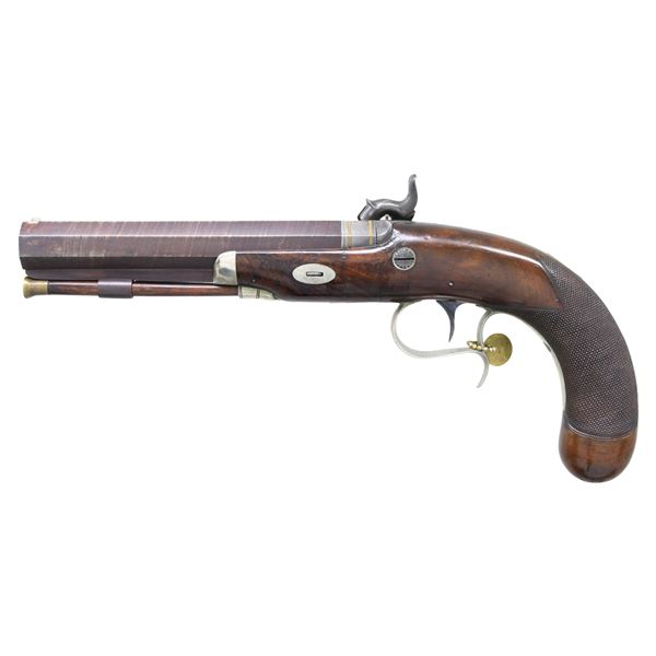 Cal. .44. S# NSN. (See above double rifle description for info on John Krider.) The browned 6-1/2". Twist octagon barrel with under rib is marked "PHILAD.a" on top flat. Case hardened breech plug does not have blow out and is inlaid with two gold bands. Breech iron with integral rear sight is engraved with acanthus scroll. Back spring lock with flat faced hammer is marked "KRIDER" and engraved with open scroll within geometric borders. American walnut stock with checkered bag grip and German silver tip attaches to barrel with captive sidebolt through oval silver escutcheons. Stock is German silver mounted. Trigger guard has pineapple type finial and finger spur. Hickory ramrod with brass tip mounts through single plain pipe and nicely filed German silver thimble. CONDITION: very good. Barrel retaining most of a re-brown showing twist finish. Some case hardening color remains on iron parts. German silver shows light cleaning. Stock retains most of its original finish with quite a few marks and dings. Bore is fine; lightly frosted. Mechanically good. (01-26490/MGM). ANTIQUE. $2,000-3,000.