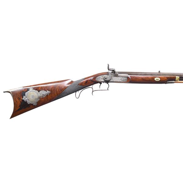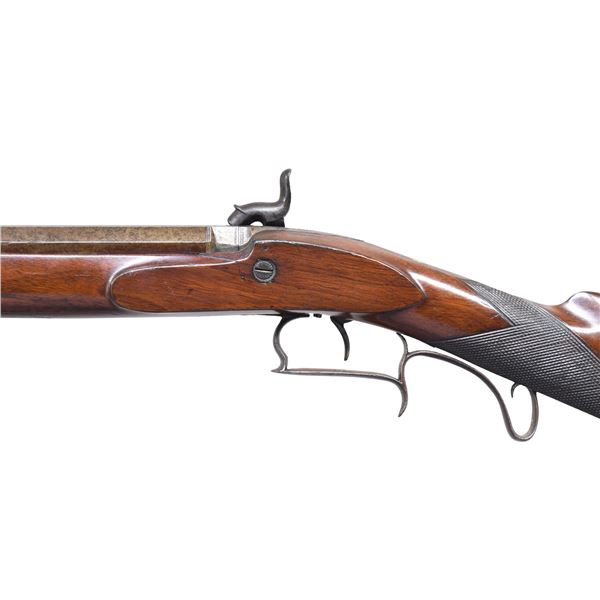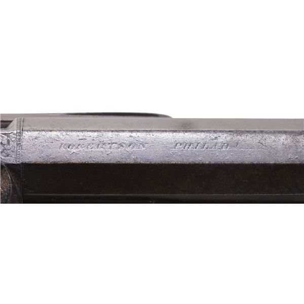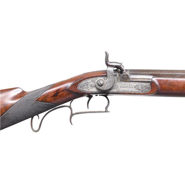 BY ROBERTSON. Cal. 36. S# NSN. William Robertson was known to be working in Philadelphia at 102 Carpenter Street in 1829. This rifle has 29-1/2" octagon barrel with under rib holding one standing left rear and silver blade front sights. Top flat is engraved "ROBERTSON PHILAD.a". Unvented breech plug has scroll on top flat. Breech iron is nicely engraved with shaded scroll and shell motif. Front spring lock with flat faced percussion hammer is engraved with matching scroll within geometric borders; "ROBERTSON" is at front. Single trigger is set. Trigger guard with pineapple finial has finger spur on bow and curl at rear forming pistol grip. Crotch figured American walnut stock with German silver tip has swept right hand cheekpiece and point pattern checkering at grip. Stock is iron mounted. Crescent buttplate with square top tang has 13-1/4" LOP and 5" return with pineapple finial. A circular patchbox with fancy steel surround is on right side of butt. All furniture shows some open scroll engraving. Stock attaches to barrel with captive sidebolt through oval German silver escutcheons. Hickory ramrod with German silver tip mounts through two plain pipes and well filed steel thimble. CONDITION: good to very good. Barrel with most of its original finish shows light cleaning with salt and pepper appearance. Other iron parts also show cleaning to silver and pewter gray. Stock shows oil added over what appears to be most original varnish finish with some dark areas and scattered marks. Bore is fair to good; strong rifling; dark in grooves. Mechanically good. There is an old crack running from lock pin on left side up to rear of barrel; otherwise stock is sound. (01-26483/MGM). ANTIQUE. $3,500-5,000.