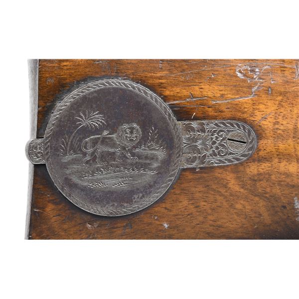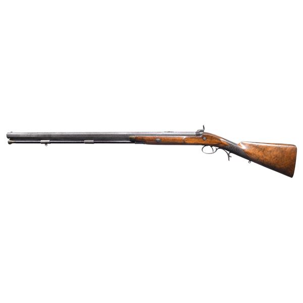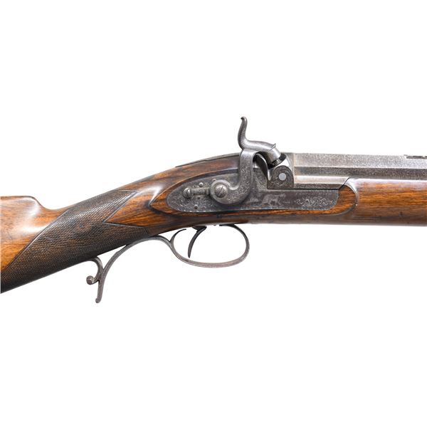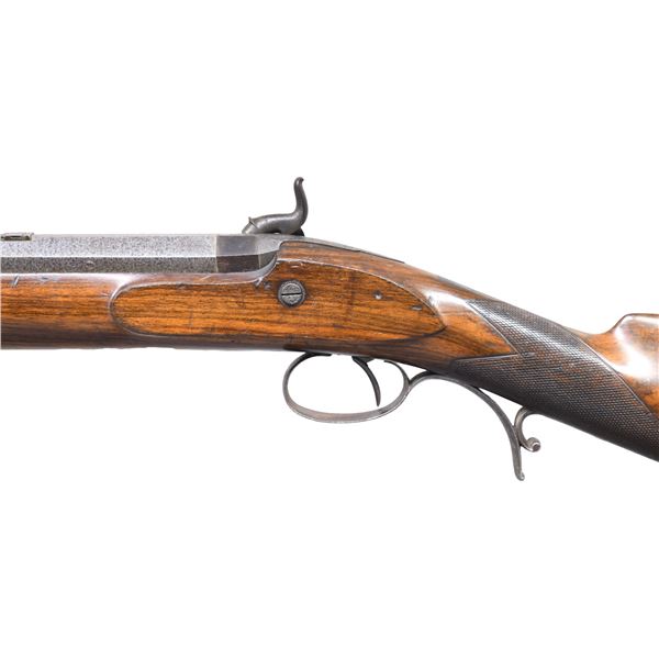 BY GEORGE CLOUGH OF BATH. Cal. 14 Bore (.700 bore dia., groove dia. .785).(1/4 turn in 30"). S# 1967. The 30" twist octagon barrel with under rib is fitted with three folding leaf rear sights with platinum lines but without notches marked for 100, 150 & 200 yards. Front sight is a silver bead. Top of barrel is engraved "Clough Southgate Street Bath" (working at this address 1832-37). Bottom of barrel is stamped with S# "1967" and with London black powder proofs for 14 bore. Patent breech engraved with lions face on top has non-vented platinum blowout. Breech iron is very nicely scroll engraved. Front spring percussion lock with serpentine flat faced hammer having dolphin head is fitted with back sliding safety. Lock and hammer are engraved with well cut open scroll with scene of prowling tiger in front of hammer. "Clough Bath" is at top front. Trigger is set. Trigger plate has stylized pineapple finial. Trigger guard has scene of running stag on bow and S# on tang that extends to form pistol grip. Half stock with horn tip of dense, stump figured European walnut measures 14-1/8" over steel buttplate with long top tang engraved with a standing stag. Right side of buttstock is fitted with patchbox having spring loaded cover which is engraved with scene of a lion, palm trees in background. Flat top modified point pattern checkering is at grip and a vacant silver oval is at top of grip. Stock attaches to barrel with captive sidebolt through engraved oval steel escutcheons. Original mahogany ramrod with horn tip and brass tail (worm under cap) mounts through two plain pipes and matching thimble. Sling eye is on front pipe which matches eye in buttstock. CONDITION: good. Barrel shows cleaning overall with traces of pattern remaining under a cleaned and pitted salt and pepper effect. A considerable amount of case hardening color remains on patent breech, breech iron and lock. Trigger guard shows considerable pitting. Some original blue is on buttplate and patchbox retains some color. Stock retains most of its original finish with a large number of marks both large and small. Bore is very fine; mostly bright and shiny with some light pitting toward muzzle. Lock is crisp. Safety and trigger work. (01-26559/MGM). ANTIQUE. $2,000-3,000.