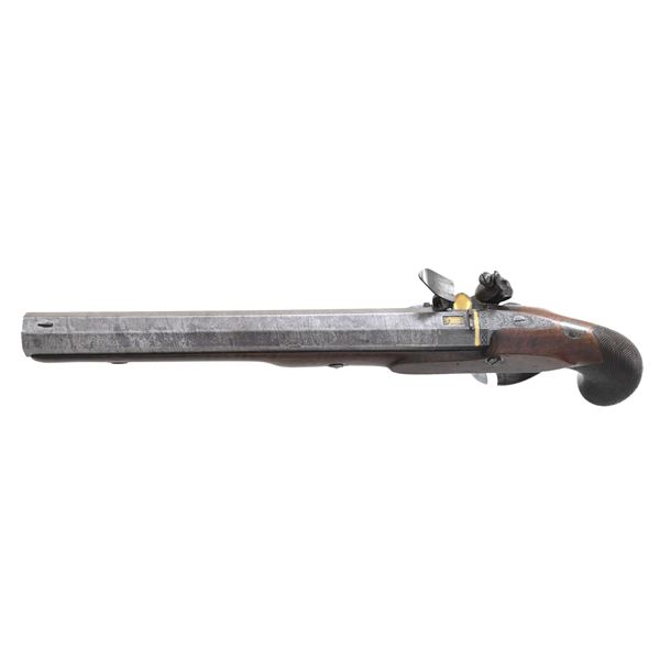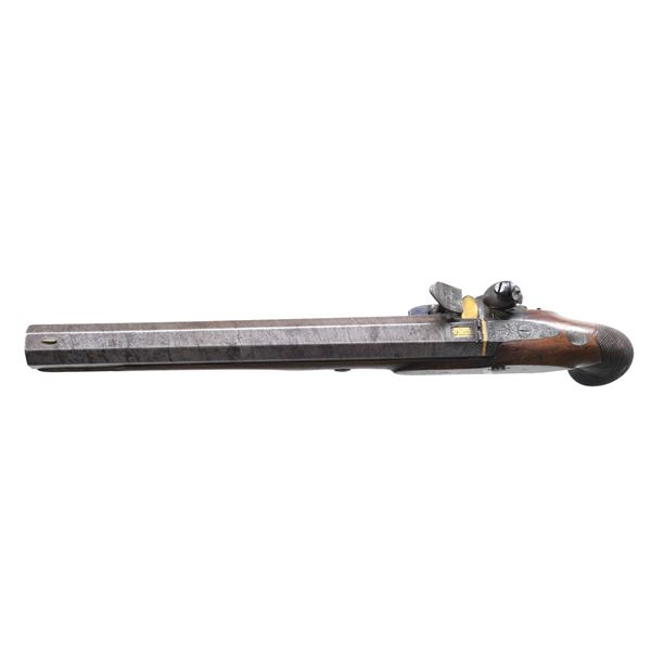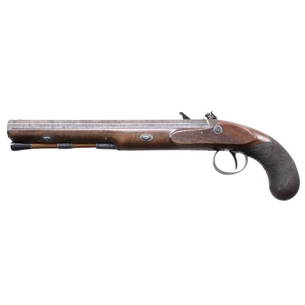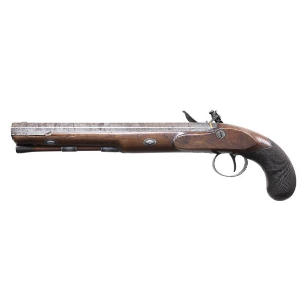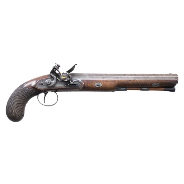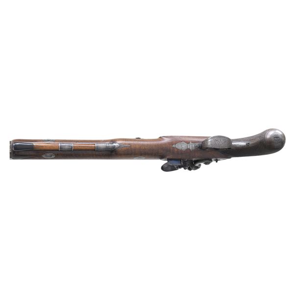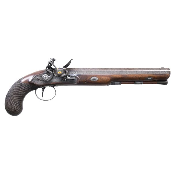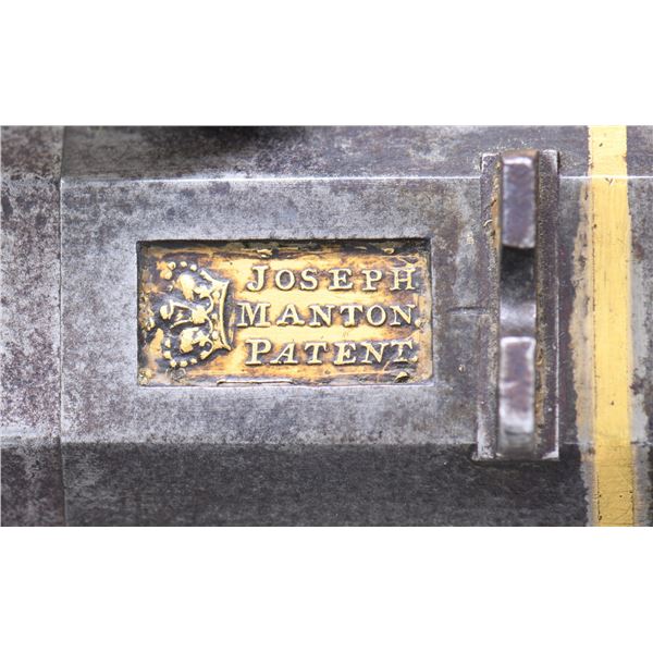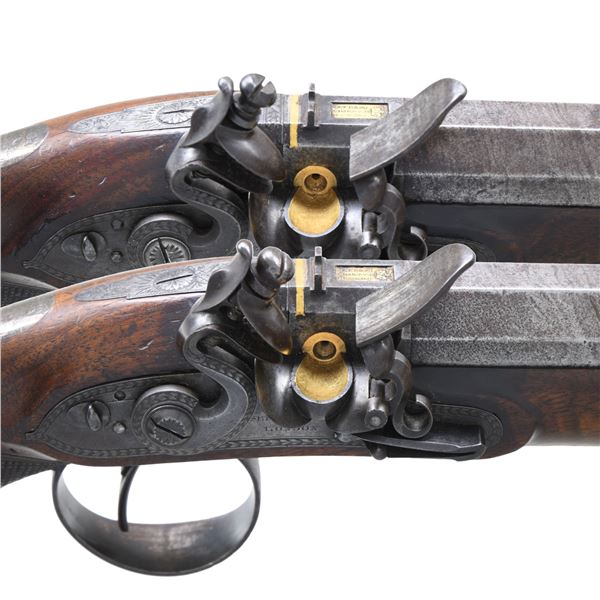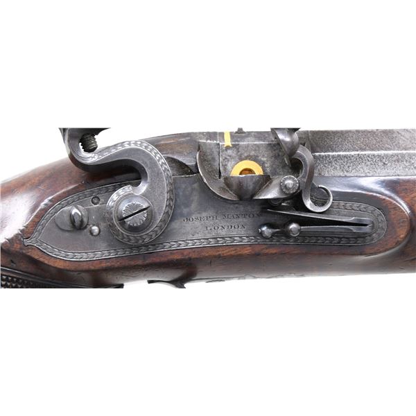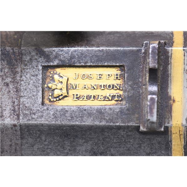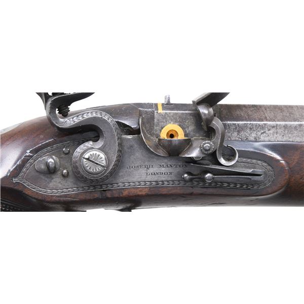 DUELLING OR HOLSTER PISTOLS EX BEDFORD COLLECTION. Cal. 54 (both). S# 305 (both). 10" twist octagon barrels with scratch rifling are unmarked on tops. Gold poincon on tops of breeches are marked "Joseph Manton Patent". Gold lines are at rears. Breeches are inset and gold touch holes are recessed. Breech irons are engraved with stands of arms. Small locks with flat plates are fitted with serpentine cocks, with back sliding safetys, gull wing type gold lined semi-waterproof pans, bridled roller frizzens and feather springs with bulbous finials. Locks are feather border engraved with "JOSEPH MANTON" "LONDON" under pans. Trigger plates have pineapple finials. Trigger guards are engraved with stands of arm. Stocks extend to muzzles in early fashion and have checkered bag grips with steel caps engraved with crossed arrow and club devices. S#'s are not visible with out barrel removal. Silver ovals at tops of grips are engraved with the crown of a viscount over what is reported to be the Hamilton family crest. Stocks attach to barrels with two captive sidebolts through oval silver escutcheons. Hickory ramrods with horn tips mount through beaded pipes and matching thimbles. These guns are listed on page 215 of "The Manton Supplement" as being made in 1791 with a brief description and at the time were owned by C. P. Bedford USA (famous collection and book "Early Firearms of Great Britain and Ireland from the Collection of Clay P. Bedford"). CONDITION: good. Metal retaining traces of original finishes showing considerable wear and cleaning to gray-brown. A good deal of temper blue remains on feather springs. Stocks retain most of what is probably an old oil refinish with many marks and scratches. A 2" x 1/4" piece of wood is missing from left front barrel channel of one pistol with crack continuing for another 2", otherwise stock is sound. The other pistol shows some cracks toward muzzle but no missing wood. Locks and frizzens are crisp. Safetys do not slide easily. Scratch rifled bores are dark with scattered pitting. (01-26466 & 01-26467/MGM). ANTIQUE. $6,000-8,000.