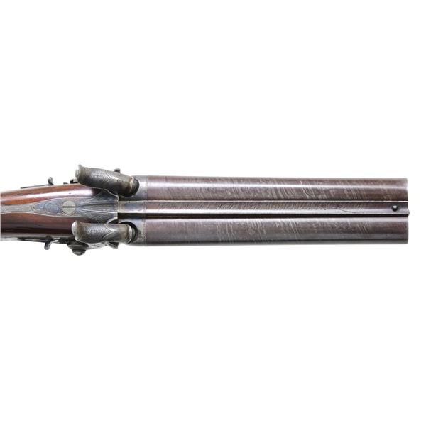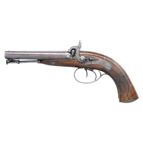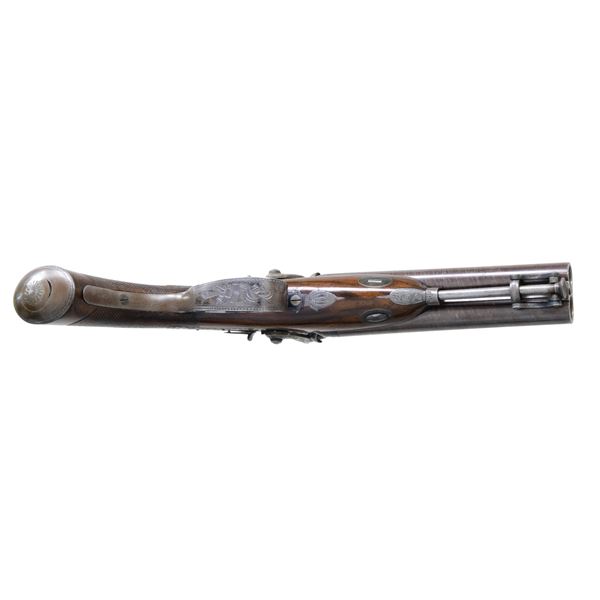 PERCUSSION PISTOL. Cal. 50 smooth bore. S# 8451. The 6" twist barrels are engraved "Jos.h Manton Holles Str.t CAVENDISH SQ.re London" on narrow rib. Barrels are fitted with bridled and swiveled steel ramrod. Rounded percussion breeches have unvented platinum blow outs. Breech iron has long top tang and is scroll engraved. Back spring locks with serpentine round bodied hammers and back sliding safetys are engraved with open scroll. "Joseph Manton" "London" is at rear of each lockplate. Trigger plate has pineapple finial and trigger guard has stand of arms and music books on bow. S# is on tang. Dense European walnut stock with slight fish tail checkered grip has a steel cap with trap and vacant silver rectangle at top of grip. Stock attaches to barrel with sidebolt through oval silver escutcheons. CONDITION: very fine. Barrels retaining over 90% original brown. Case hardened parts show some fading and silvering mostly on rear of top tang and rear of lockplates. Trigger guard retains about 30% of its bright blue. Trigger blades and safetys retain most of their temper blue. Stock retains nearly all of its original French polish finish with a good number of marks and dings. Bores are very good with some light pitting. Mechanically fine. (01-26468/MGM). ANTIQUE. $3,000-4,000.
