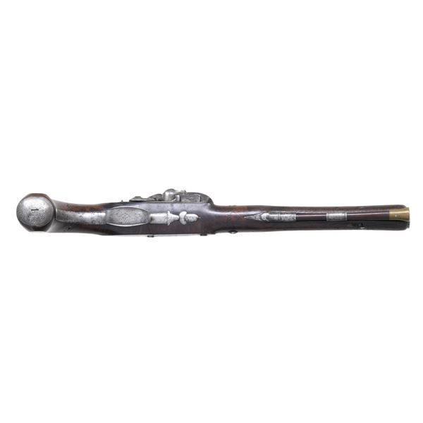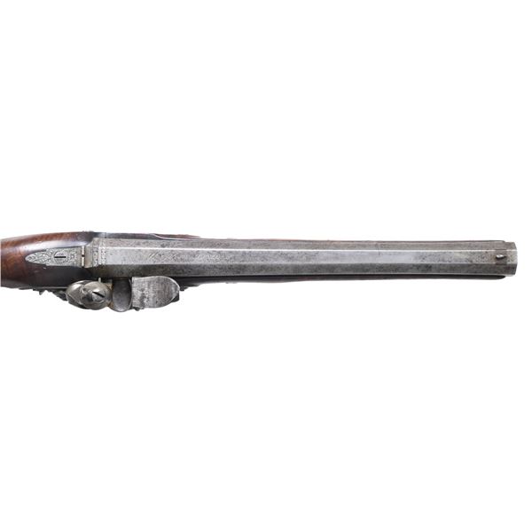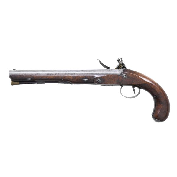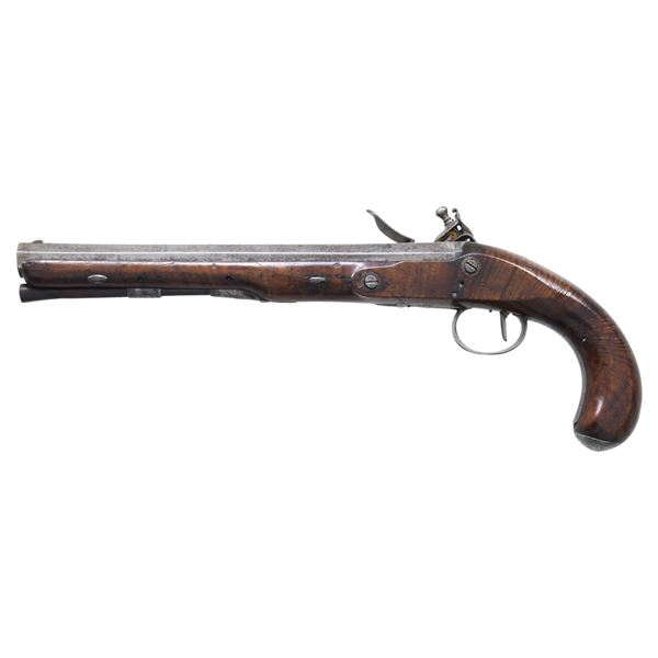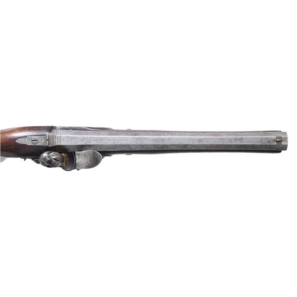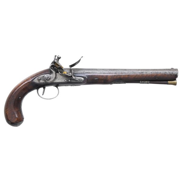 DUELLING/HOLSTER PISTOLS. Cal. 59. S# NSN. Robert Wogdon specialized in making duelling pistols. His production spans from the early 1770's until 1803. His name became synonymous with duelling and these confrontations gained the name of "Wogdon Affairs". George Washington owned a pair of Wogdon pistols and Wogdons were also used in the Burr-Hamilton duell. Although called duelling pistols it is most probable that this type of weapon was given daily use by anyone who needed to travel by horseback and the pistols were removed from their case in the morning and placed in saddle holsters throughout the day. These standard grade pistols date from around 1775 with their 10" swamped octagon barrels engraved "Wogdon LONDON" on top flat. Touch holes are gold lined. Breech irons which are nicely engraved have integral rear sights. Flint locks with chamfered plates and rebated tails are fitted with serpentine cocks, back sliding safetys, integral rounded pans, bridled friction frizzins and feather springs with bulbous finials. "Wogdon" is engraved under pans. Trigger plates are fitted with set triggers. Trigger guards with double beaded bows have large acorn finials in use throughout the 1770's. Stocks made of root juncture European walnut with some fiddle figure extend to muzzles and have flat side bag grips. Grip caps are steel. Light engraving is found on trigger guard bow and grip caps. Stocks attach to barrels with two captive sidebolts without escutcheons. One greenheart ramrod has brass tip; the other horn. These pistols were made before Wogdon provided his famous loading attachment on tails. CONDITION: good. Barrels show old cleaning to gray and scattered overall pitting. Locks are also smooth gray brown. Furniture condition matches barrels. Stocks retain old, possibly original, finish and show considerable wear. Both stocks are sound showing a few minor cracks, most notably lower left of one side of pistol from trigger guard to attachment pin. Bores are good; lightly pitted. Locks are fine; complete without any noted repairs. Main spring on one pistol is quite weak. This lock also does not have a half cock notch. (01-26469 & 01-26470/MGM). ANTIQUE. $5,000-7,000.