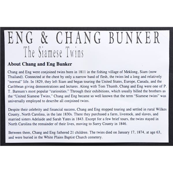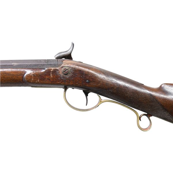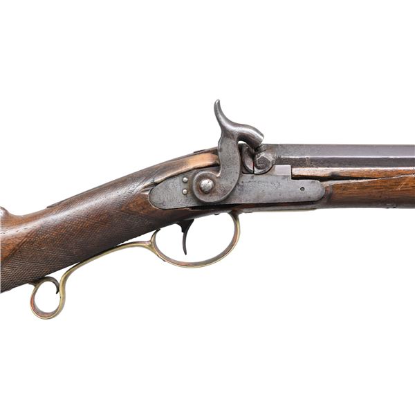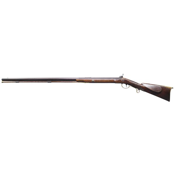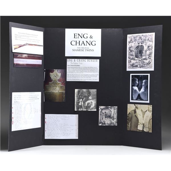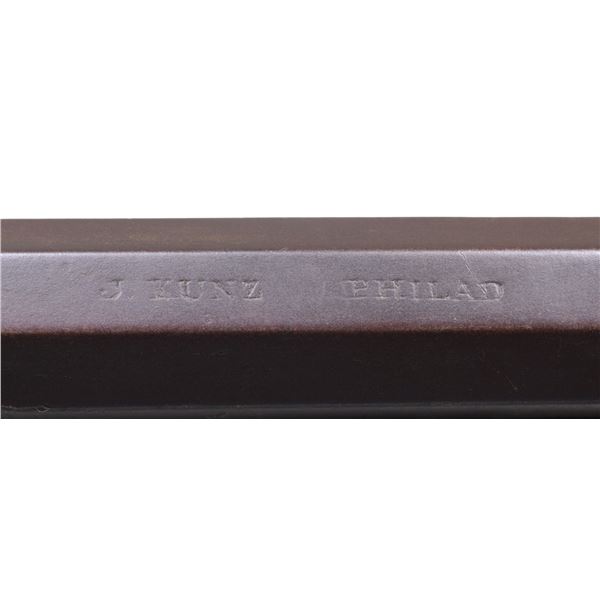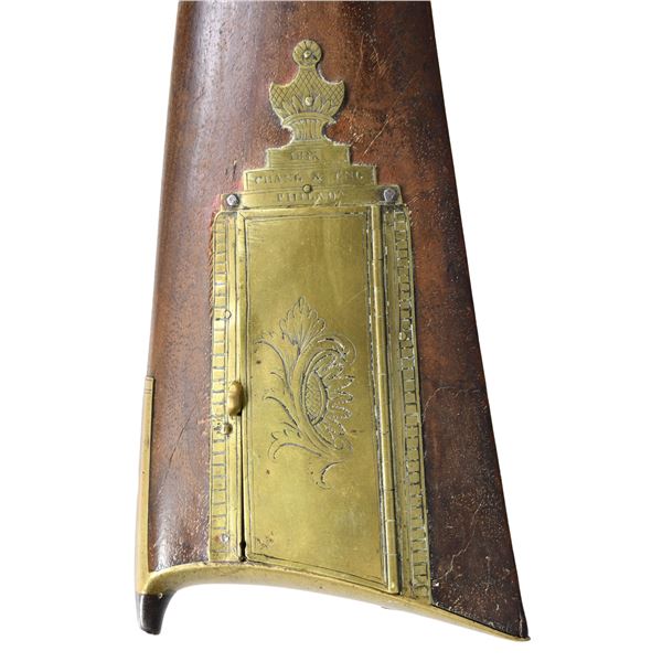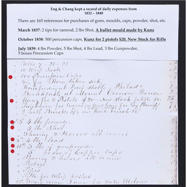 FAMOUS TRICK SHOOTING SIAMESE TWINS Cal. 54. NSN. 53" overall, 36" octagonal to round smooth bore rifle signed on top barrel flat "J KUNZ PHILAD". The large engraved brass patchbox is inscribed "1837 / CHANG & ENG / PHILAD". Chang and Eng made the term "Siamese twins" part of current vocabulary. As teenagers they were part of PT Barnum's famous sideshow. Consigner has put together a nice display board showing an entry from 1837, Kunz pistols and new stock for rifle, 4 lbs powder, 4 lbs lead, and five boxes of percussion caps, along with copies of woodcuts showing the famous twins shooting rifles. Chang & Eng Bunker (1811-1874) born in Siam (Thailand) were brought to America and became the most studied anatomies of the 19th century. They toured with different managers including PT Barnum from 1829-1832 but did not like their treatment in "freak shows" and were cheated by their managers. They decided to tour on their own, exhibiting their athletic and shooting prowess. They held conversations in dignified parlor settings in English. In 1839 with large financial success, they retired from show business and moved to Mt. Airy, NC, became slave owning American citizens, married local sisters, and fathered 21 children. By 1845 they were one of the wealthiest families in Surry County, each having a home that they would go back and forth every few days with children and wives holding up the households. They lived in luxury as plantation owners in 1850 with fancy luxury goods with servants and slaves. When the Civil War came, they did their patriotic duty, sending two sons into Confederate service, and buying Confederate bonds which became worthless after the war and they lost considerable portion of their wealth. They would take up touring again taking several of their children with them. There is an annual family reunion for descendants of Chang & Eng, totaling close to 2000 currently, with several prominent names. There has been much written about the original Siamese twins, including several scholarly books of which five are included in this lot. There is also a World War 2 history written by Major General Vance Haynes who was one of Chang's many grandsons. Chang & Eng are buried in Baptist Church cemetery in Mt. Airy. UNATTACHED ACCESSORIES: large file of research and large tri-fold display board, small circa 1850 Staffordshire figure of the twins, 1829 Newspaper with account of twins being charged with assault, 19th century woodcut of Chang & Eng with their wives and many children, Chang & Eng commemorative shot glass, and 5 biographies of Chang & Eng. CONDITION: good to very good overall, old broken sliver of wood forward of lock, good markings, lock cleaned to gray, barrel has dark iron patina. (01-26461/JS). ANTIQUE. $4,000-8,000.