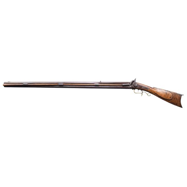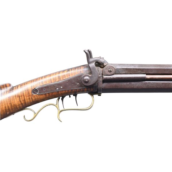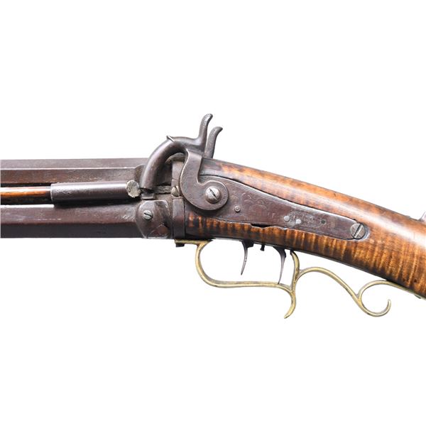 Cal. 45/12ga. NSN. Bbls are 35 1/2" w/ oct shanks having faceted transition to rnd. Brass blade front sight w/ fixed v-notch rear sight. Engraved back action trade locks marked "C.G. GOLCHER". Double set triggers. Curly maple cheekpiece stock w/ steel crescent buttplate and toeplate. Brass finger curled trigger guard. Right side of stock has an ornate inlaid circular lid German silver patchbox. Hand engraved wavy line border w/ the all scene eye at the center of the lid. Hardwood ramrods are held on either side of bbl by faceted iron pipes. WEIGHT: 10 lb 1.2 oz. CONDITION: metal shows a heavy brown patina. Stock shows light wear and handling marks. Right lock will not hold in full cock position. Dbl set triggers are not functioning properly. Rifle bbl has dark lightly pitted appearance w/ worn rifling. Shotgun bbl has dark pitted bore. (01-26553/DS). ANTIQUE. $800-1,200.