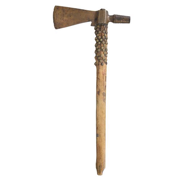 This tomahawk features a brass head that measures 9 1/4" in length by 2 3/4" at the bit. The blade is just over 5" long, and the pipe is about 2 1/2" long. The heavy, massive eye has vertical lineal decoration combined with horizontal lineal decoration at the base of the pipe. The pipe bowl has five incised lines that form four circular rings. The haft measures 19 1/2" long and has numerous domed brass tacks covering the top 4 1/2" of the haft. The bottom of the haft is carved to form a mouthpiece for the pipe. The haft is a light-colored hardwood and shows a few tight cracks from drying. CONDITION: the brass head has a dark, ancient, mustard patina, and the inside of the pipe bowl is quite dark. The tacks have a patina that reasonably match the head. The haft has traces of file branding that, in most places, has worn completely away. (02-23585/BF). $2,000-3,000.