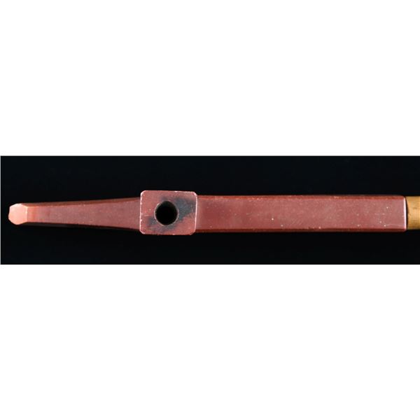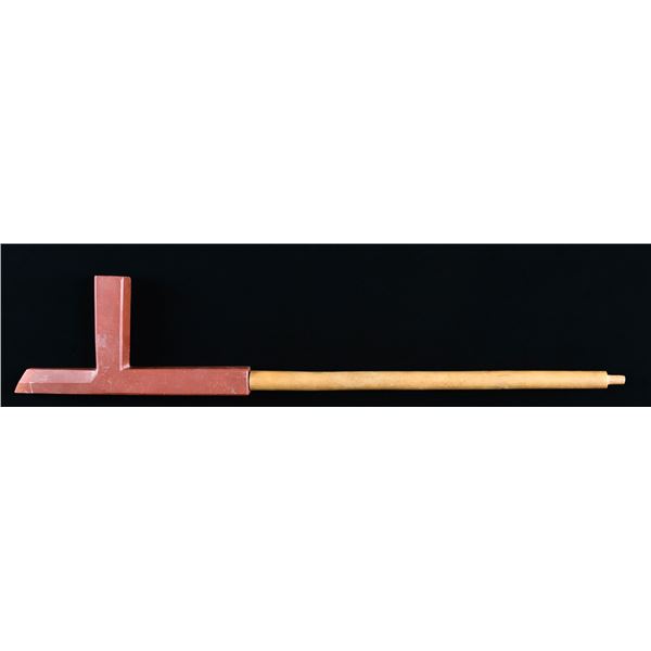 This pipe has an overall length of 24 1/2" with a rectangular chamfered head that measures 9 1/2" with a 4 3/4" high bowl. The round wooden stem is 15" long, including the 3/4" mouthpiece. CONDITION: the Catlinite head shows very minor wear to the edges and some charring around the bowl. The wooden stem generally shows light wear. (02-23593/BF). $1,000-1,500.