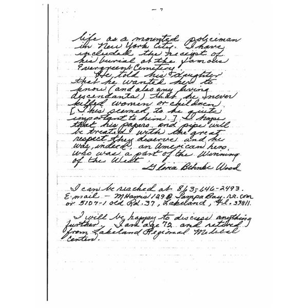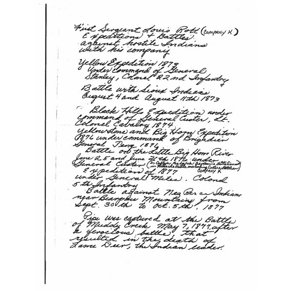 G. A. CUSTER SIGNED 7TH CAVALRY DISCHARGE, 1874. 15.5" x 10" document in 24" x 18" archival frame. Louis Rott would reenlist again in less than a year in January 1875. Louis Rott was survivor of the "Hilltop Fight" at Little Big Horn and was nominated by his commander Captain E. G. Mathey for the Congressional Medal of Honor. Several of his comrades received the medal for identical service, risking their lives retrieving water for wounded troopers during the Hilltop fight. This document, on vellum, is finely written in blue & red ink. Custer signs his name boldly as "Lieutenant Colonel of Cavalry" & "Brevet Maj. General USA.". This is rarely seen special vellum discharge instead of more commonly encountered paper. Louis Rott (1849-1897) an emigree from Germany in 1870, joined the 7th US Cavalry in 1872. His campaigns with Custer include the Yellowstone Expedition in 1873, Custer's Black Hills and Big Horn expeditions 1875-1876, and General Miles' 1877 campaign into Big Horn Valley. He left service in 1878 due to disability at Ft. Rice, Dakota Territory. UNATTACHED ACCESSORIES: copy of a letter from Gloria Wood who states she is the last living descendant of Sergeant Louis Rott and she consigned this to auction. CONDITION: archival framing not removed, therefore discharge has not been examined out of the frame. It appears that prior to framing the document was professionally reinked. Toning to vellum and cracks at folds with minor curling. Signatures of Custer and Cooke are bold and easily read. PROVENANCE: from Louis Rott, 7th US Cavalry, descent of family to last surviving member; Gloria B. Wood; Heritage Auctions 2011; Martin Lane Historic & Western Americana Lifetime Collection. (02-23299/JS). $4,000-6,000.