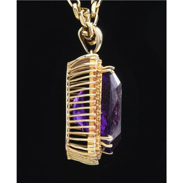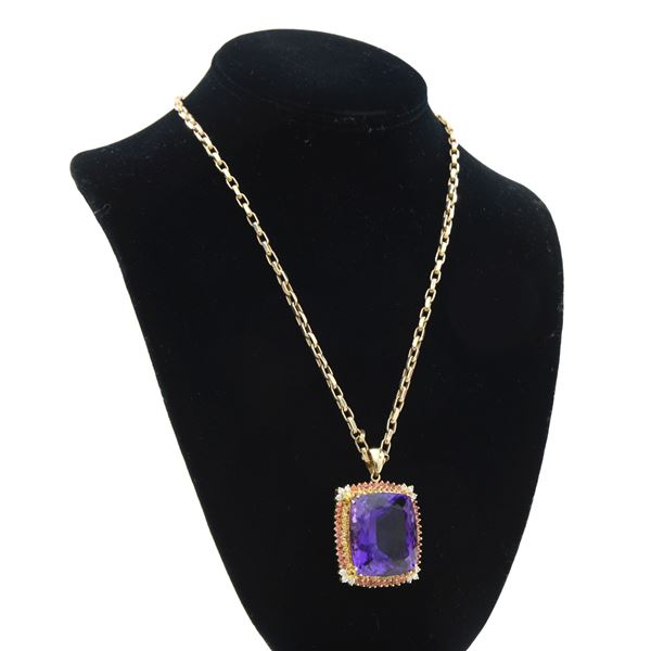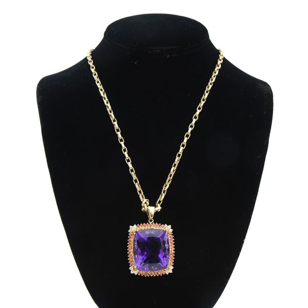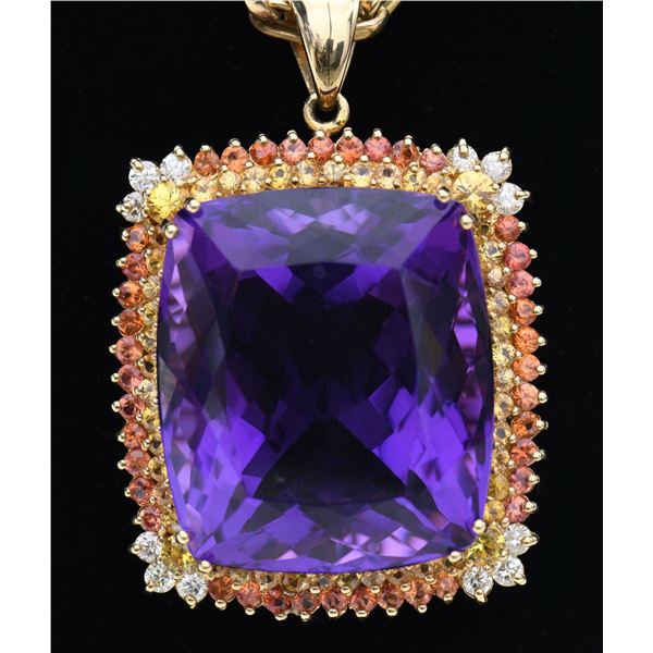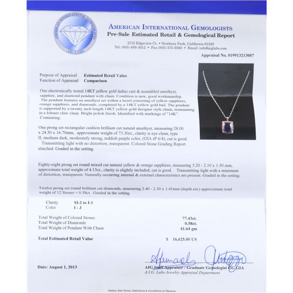 PENDANT NECKLACE. 14kt yellow gold (tested) open link design 20" chain suspends a rectangular cushion brilliant cut amethyst measuring 28.00 x 24.50 x 16.70mm with an approximate weight of 73.30ct with eye clean clarity, Type II, reddish purple color with good cut. Surrounding the amethyst is a row of bezel set yellow sapphires with an outer row of orange sapphires measuring 3.20 - 2.10 x 1.50mm with a total weight of 4.13ct being slightly included with good cut. At each of the four corners are three round prong set brilliant cut diamonds (12 in all) measuring 2.40 - 2.30 x approx 1.41mm with SI2 to I1 clarity and I-J color having an approximate total diamond weight of 0.58cttw. All stones are set in an openwork 14k yellow gold basket with bale. UNATTACHED ACCESSORIES: AIG (American International Gemologists) Gemological Report identifying the amethyst, sapphires, diamonds and chain. CONDITION: as new. (02-24241/JK). NON-GUN. $5,000-8,000.