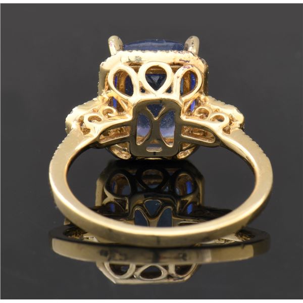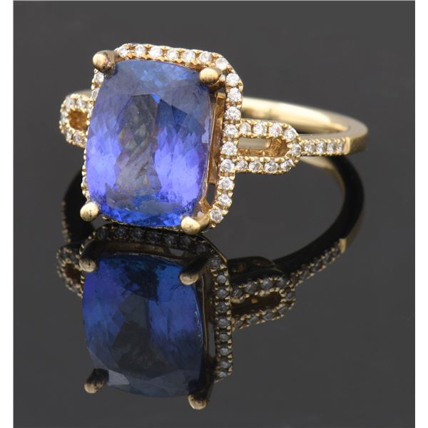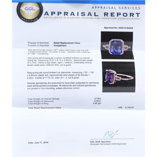 Lovely lady's 14k yellow gold (marked/tested) ring features a prong set center 3.74ct cushion brilliant cut natural tanzanite measuring 10.81 x 8.14 x 5.40mm with eye clean clarity, Type 1, bluish violet in color with a good cut. Tanzanite is mounted in an openwork gallery. Surrounding the tanzanite, shoulder and top of the openwork shank are 60 prong set round brilliant cut diamonds measuring 1.0 - 1.0 x 0.60mm (est) with a total approx weight of the diamonds 0.22cttw, clarity of I1 to I2 with I-J color. SIZE: 6.25. UNATTACHED ACCESSORIES: GGL (Global Gem Labs, LLC) Appraisal identifying the tanzanite, diamonds and gold. CONDITION: as new. (02-24246/JK). NON-GUN. $4,000-6,000.
