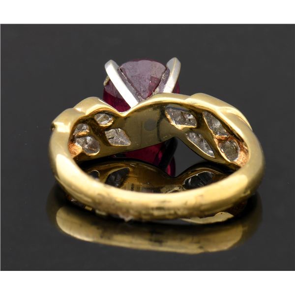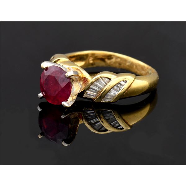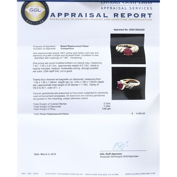 14k (tested) yellow gold ring features a round modified brilliant cut natural ruby measuring 7.40-7.40 x 4.81mm with an approximate weight of 2.13ct having a heavily included clarity with strong purplish red color and good cut in a high four prong setting. Each side of the ruby is set with 12 channel set baguette cut diamonds. The 24 diamonds measure 1.50 x 1.50 x 1.28mm to 3.00 x 1.80 x 1.53mm with a total approximate weight of 1.15ct having VS-2 to SI-1 clarity and I-J color. Total weight of the ring is approx 5.60 grams. UNATTACHED ACCESSORIES: GGL (Global Gem Labs) identifying the stone, diamonds and gold contect. CONDITION: excellent. (02-24242/JK). NON-GUN. $2,000-3,000.