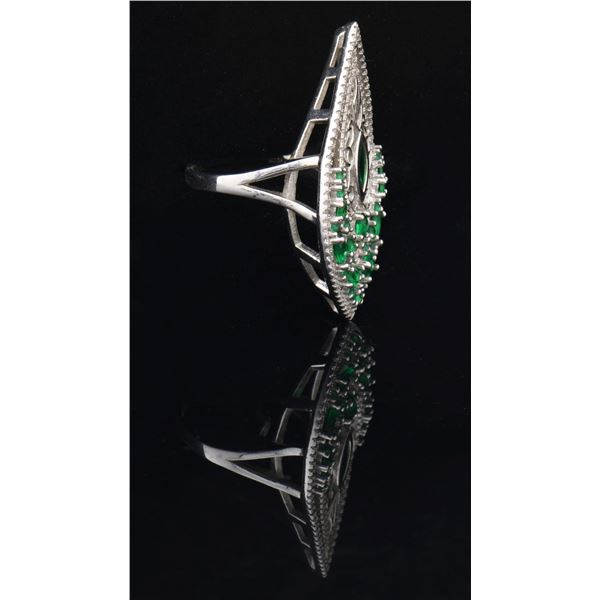 Openwork white gold ring in the shape of a peacock feather. The center of the center is bezel set with a marquis cut emerald with a prong set teardrop emerald above it surrounded by openwork designs which is bordered by a single line of small bezel set diamonds. The outer edge of the "feather" has small prong set emeralds in various cuts with the outside edge having a single row of small bezel set diamonds. SIZE: 9.75 (1 12/16" long). CONDITION: outside diamond edge is missing one stone, otherwise very good. (02-24244/JK). NON-GUN. $1,500-3,000.