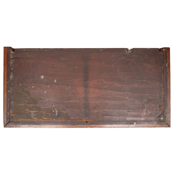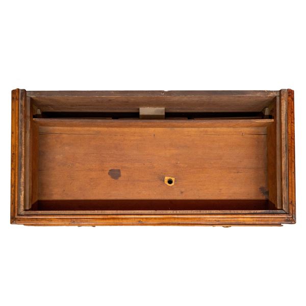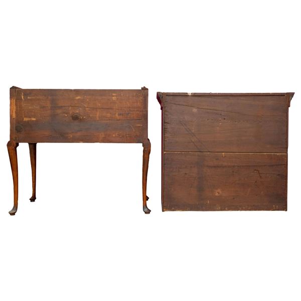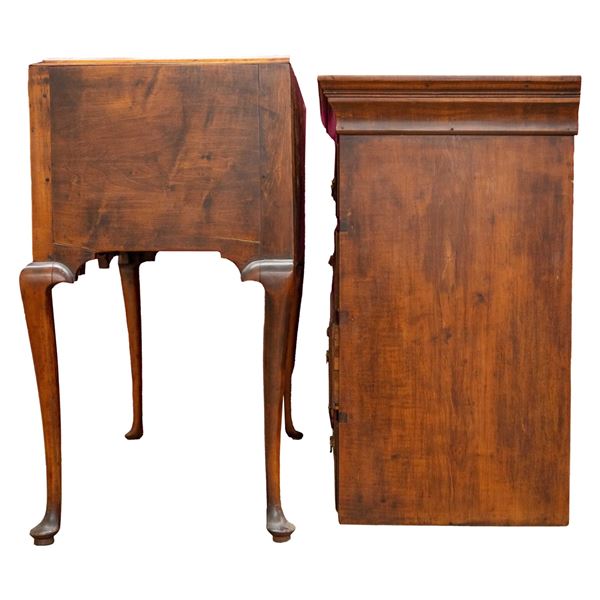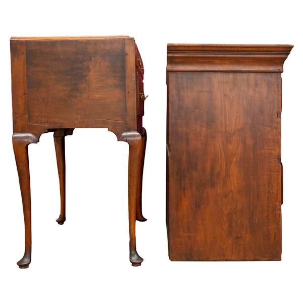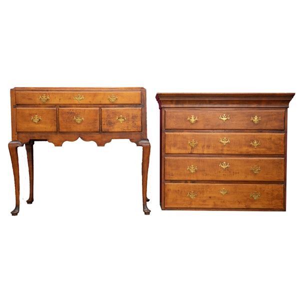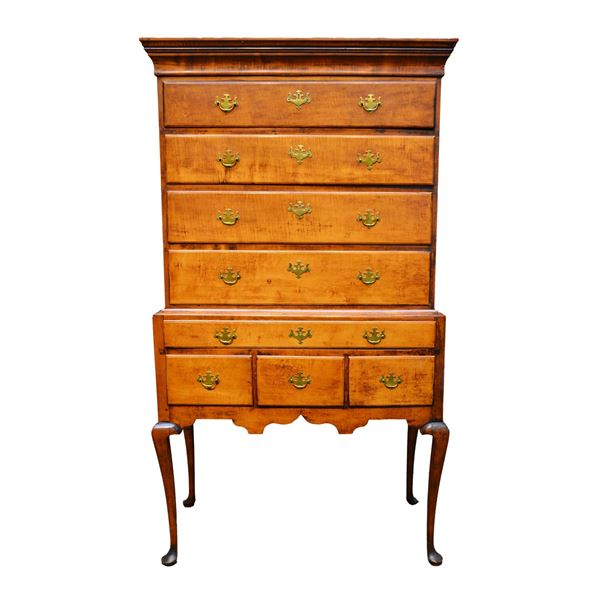 Third-quarter 18th century, New England. In two parts; the upper case with cove moldings fitted with four long drawers and molded edges. Fitted to the lower case of long drawers above three aligned short drawers over a shaped apron, raised on slender cabriole legs with carved returns on round pad feet. The highboy retains original brass hardware. SIZE: 69" h x 35" case width x 19" d. CONDITION: very good. All polished surfaces with honey brown color. PROVENANCE: Pennsylvania Estate Collection. (05-853/TG). $1,500-2,000.