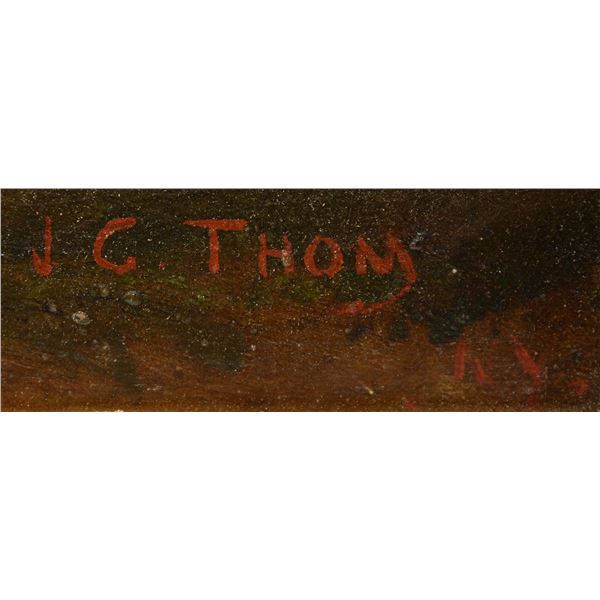 1898) DAY IS DONE. Oil on canvas depicts Indian scouts seated on rocky outcrop at sunset. Signed lower right "J.C. Thom N.Y.". Housed in a molded gold gilt frame with cast foliate decoration. SIZE: overall 38" x 45", work is 26" x 33". CONDITION: chips along edges. Otherwise very good. PROVENANCE: Lifelong California Collection. (05-989/TG). $800-1,200.