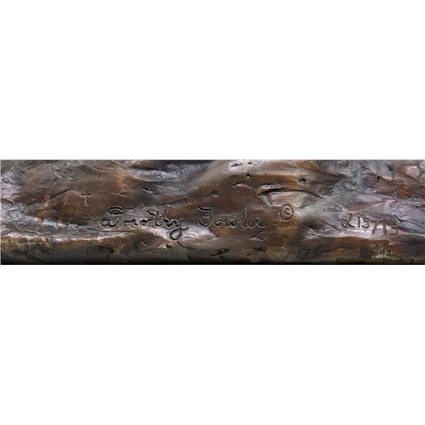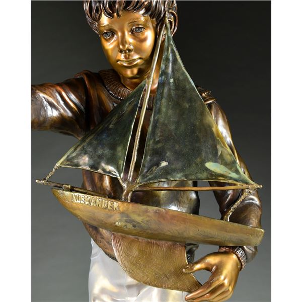 Beautiful life size figural bronze of a young boy holding a sailboat with the name 'Alexander' in his left hand. The boy stands on a rockwork plinth, pointing with his right hand. The limited edition bronze with impressed mark at rear with "15/15" of which this is the final example of the limited edition. Also marked with a clover symbol which we believe to be the foundry mark. SIZE: overall 51" h, boat is 17 1/2" x 15". CONDITION: very good original condition with undisturbed patinated surfaces. The boat at one time has been reattached to the boy's hand. (05-1023/TG). $800-1,200.