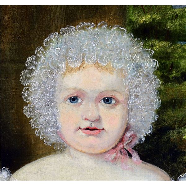 In the manner of Jan Adam Kruseman (Dutch, 1804-1862). European School. Oil on board depicts a girl in white dress and bonnet, all trimmed in lace, seated on the ground with a spray of flowers in her lap within a country landscape. Housed in a silver wood frame with gesso surround. SIZE: overall 31" x 27", sight 23 1/2" x 19 1/2". CONDITION: professionally cleaned, likely laid down on board. Horizontal fold marks are visible. PROVENANCE: from a Pennsylvania Estate Collection. (05-846/TG). $800-1,200.