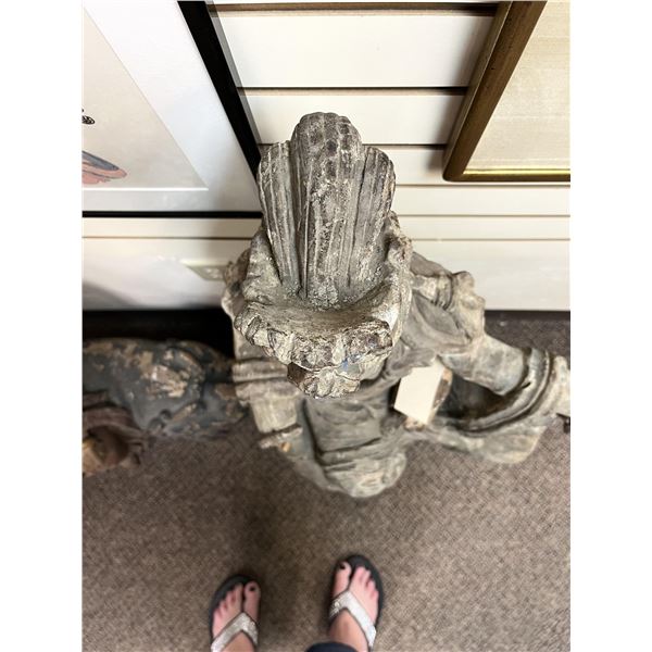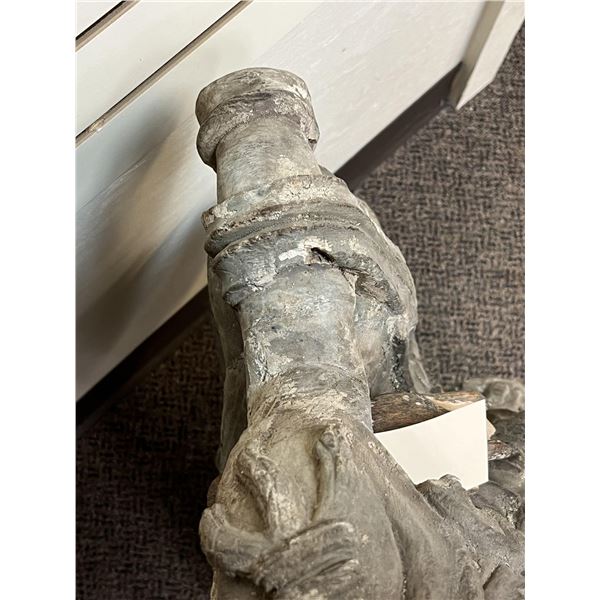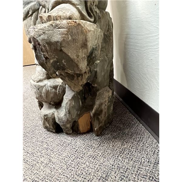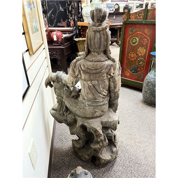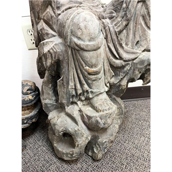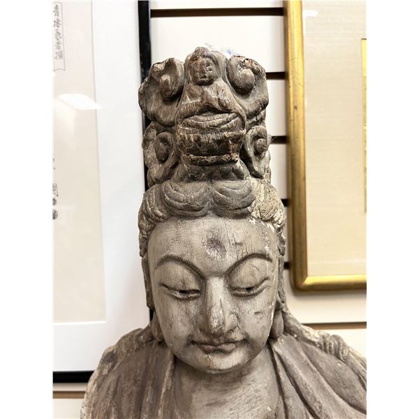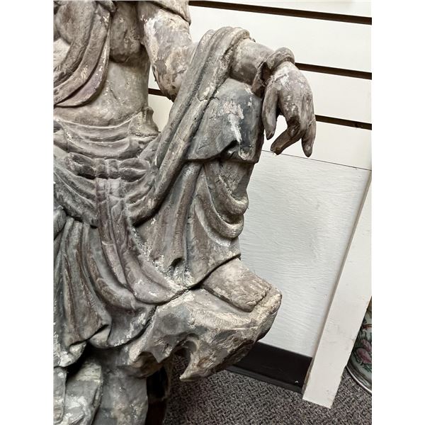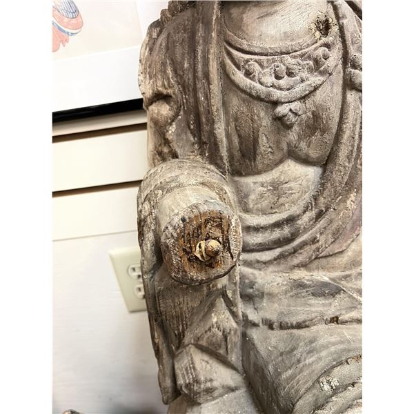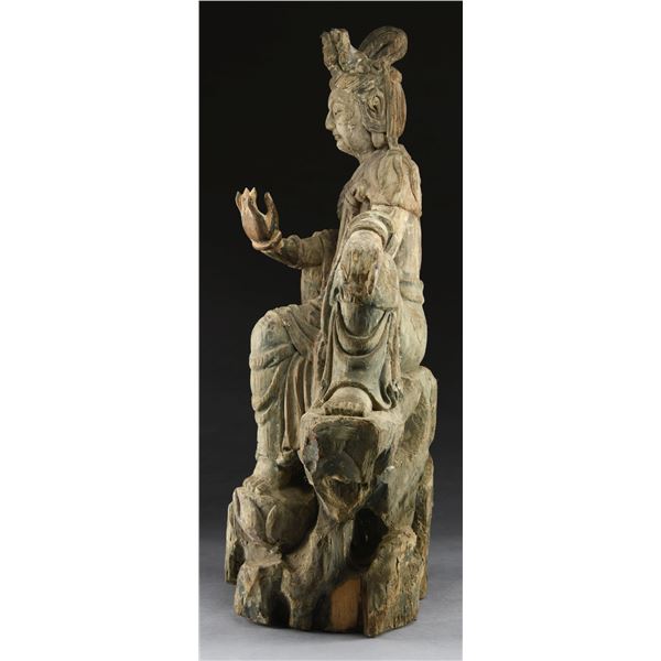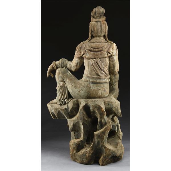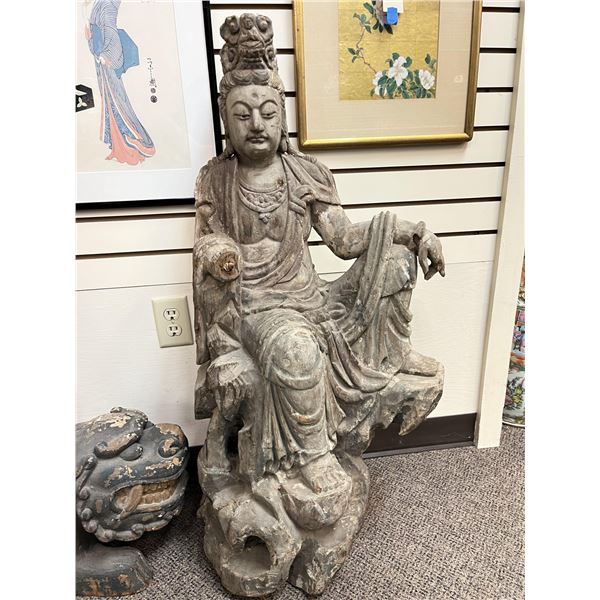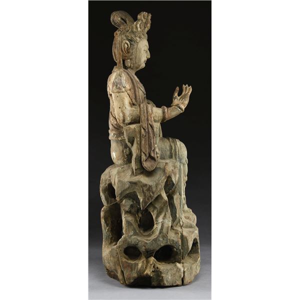 GUANYIN. 19th-20th century. The seated deity shown atop a rockery with hands in a mudra and wearing detailed headpiece. SIZE: 39" h. CONDITION: right hand detached with losses to finger tips. Loss to the edge of foot. Crack at front section of base. Scattered wear and small chips to surface throughout. (05-345/JC). $400-800.