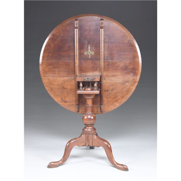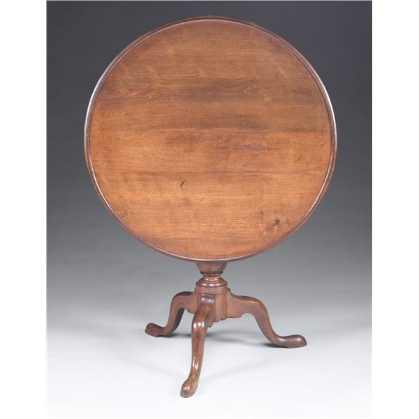 Mid-18th century, Pennsylvania. The round molded top hinged on a birdcage support, joined and swiveling on a baluster turned pedestal raised on a cabriole leg base terminating in shaped pad platform feet. SIZE: 29" h x 33" dia. CONDITION: top has been professionally restored and polished. The pedestal base retains original iron braces set within the base of the pedestal. NOTE: has old replacement 7" center strip. PROVENANCE: Pennsylvania Estate Collection. (05-832/TG). $300-500.