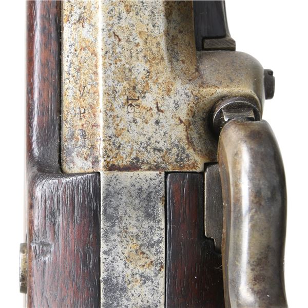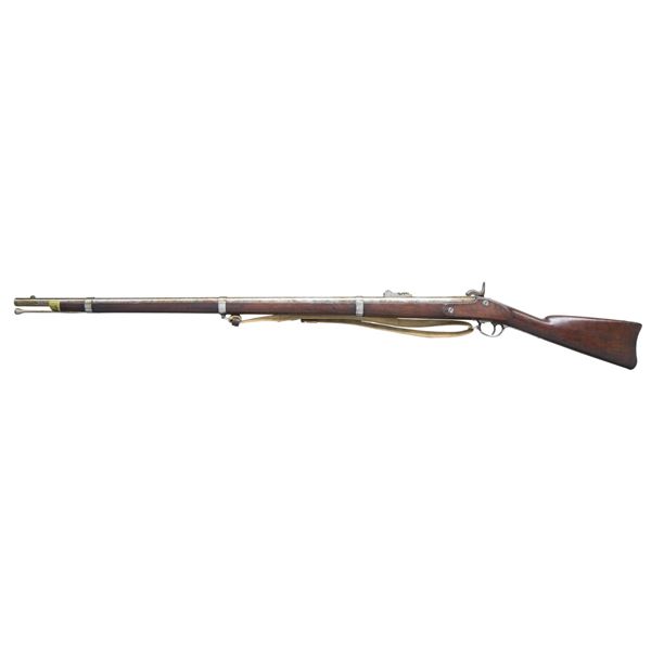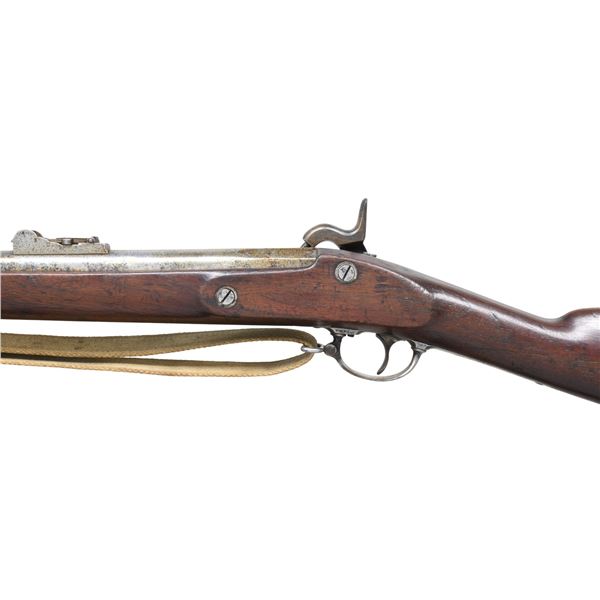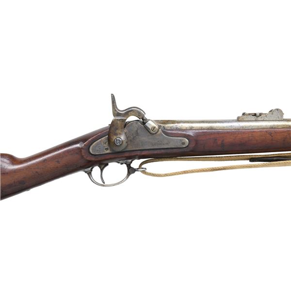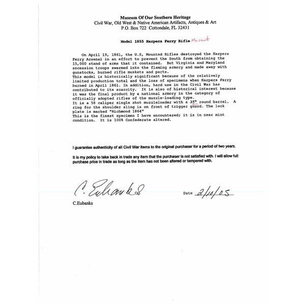 This is a very good condition, well fit C.S. Altemen Harpers Ferry model 1855 rifle musket with long range rear sight, fitted with 1864 dated Richmond lock that still has case hardened finish. The accompanying letter of authenticity states that this was Confederate alteration and it makes sense as the stock has no US inspection and Richmond lock is perfectly fitted. UNATTACHED ACCESSORIES: letter of authenticity "Museum of Our Southern Heritage", 2005. CONDITION: very good to fine overall for a Confederate associated long arm. 40" barrel retains crisp rifling and correct Harpers Ferry proofs and barrel date 1858 which last two digits are very weak, US" surcharged buttplate. The lock is exceptional with crisp "C.S. /RICHMOND" and "1864". The stock has rich hand worn patina, hairline crack at wrist unaffecting the overall aesthetic. Mechanics are crisp, rifled bore is bright. The accompanying heavy canvas & leather sling is sound and fine overall. PROVENANCE: Lifelong collection of Richard A. Baumann. (01-26016/JS). ANTIQUE. $4,000-8,000.
