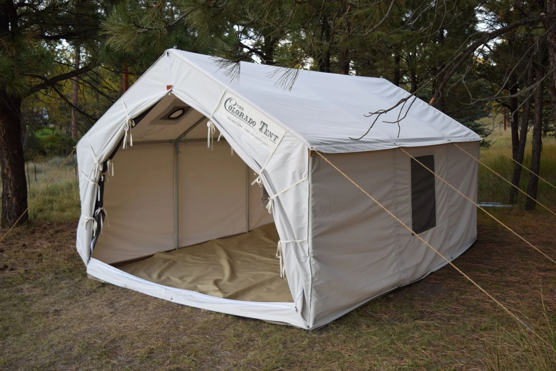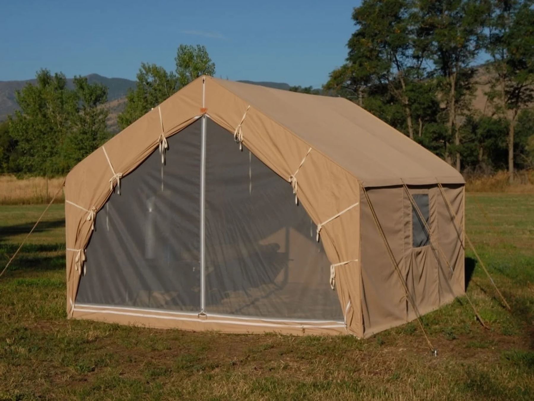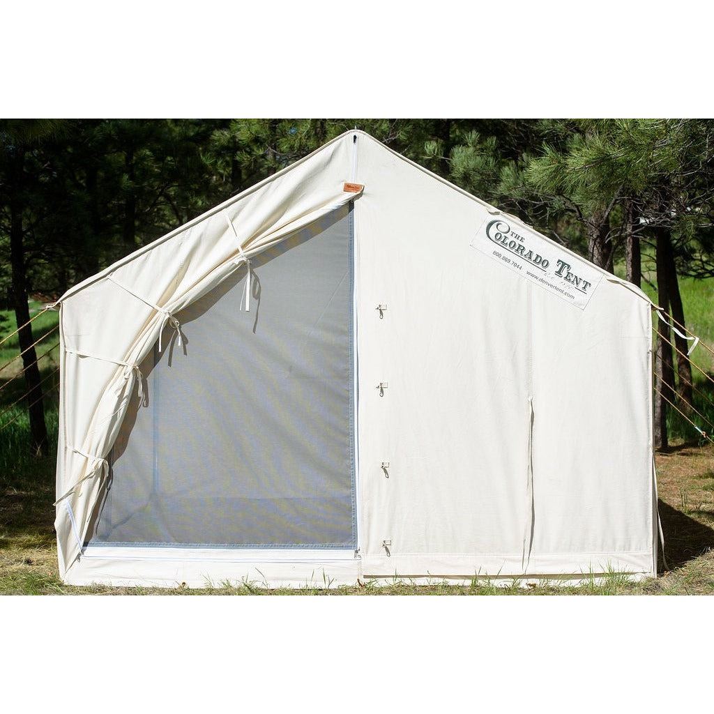 This 12x14 Tent has 3" Heavy Duty webbing sewn into all eaves, ridge corners and peaks and 1.5" Heavy Duty webbing sewn into grommet hem. With double grommets along eaves for added security and grommets in front/back of peak to secure tent to frame with eyebolt. Flies also have matching grommets. Zippered peak opening for extended awning or cookshack frame attachment. 9" 18oz heavy-duty vinyl around perimeter of tent to keep pests and water out. Allows for easy entry/exit and near complete opening of doors. Canvas flap over zippers to protect from elements. Secured with fireman buckle snaps. Has 2 rectangular windows and 1 triangle. Canvas flaps zip close inside the tent and have tie down rope to secure the flap when open. Flaps inside the tent allows for closure during weather. 5" Oval Fiberglass Stove Pipe Shield for added flame/heat protection around stove pipe.