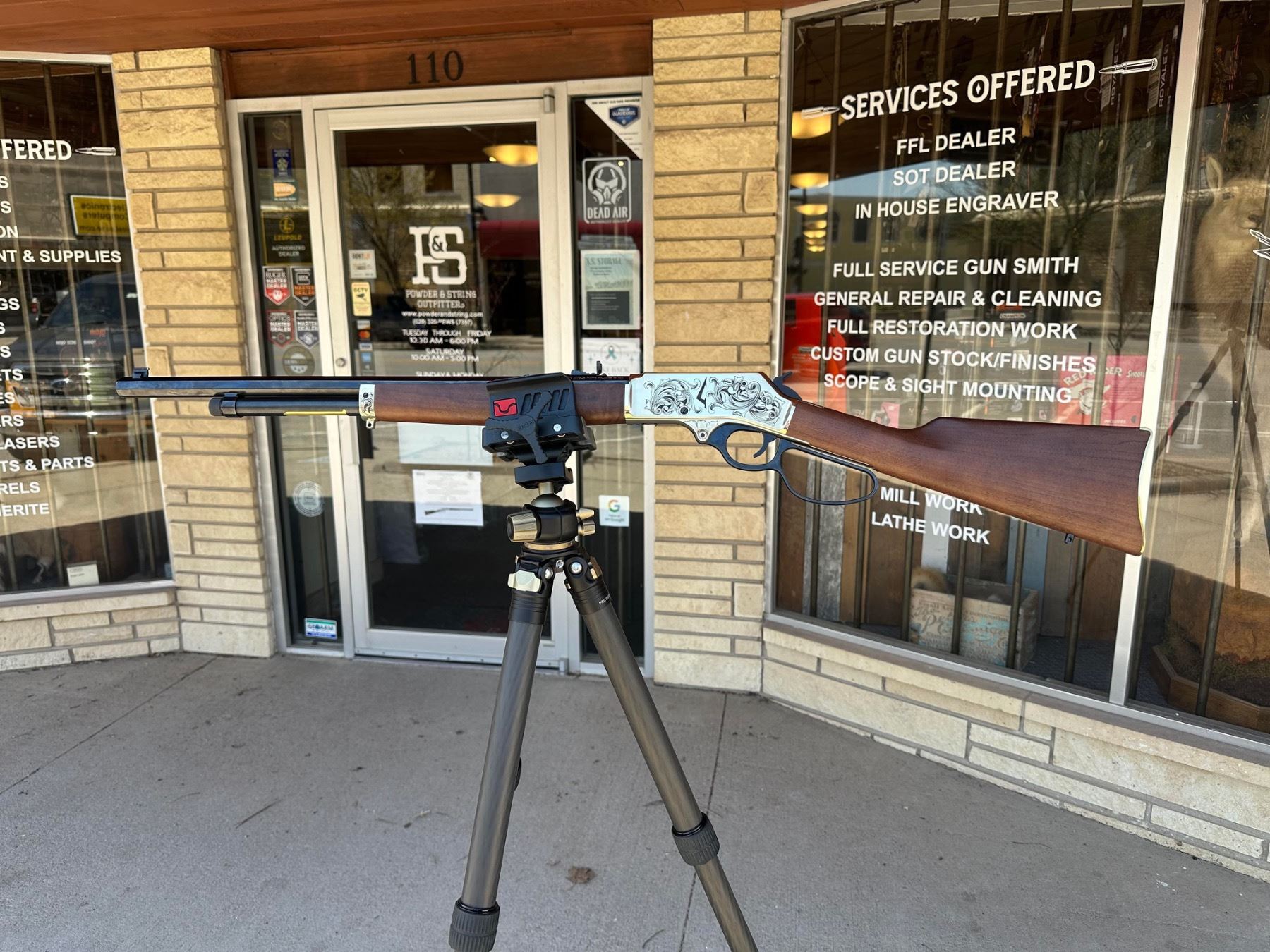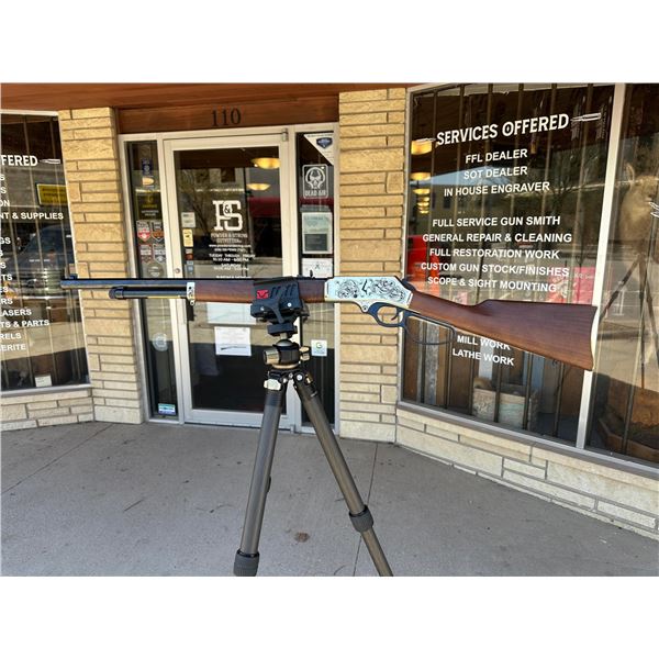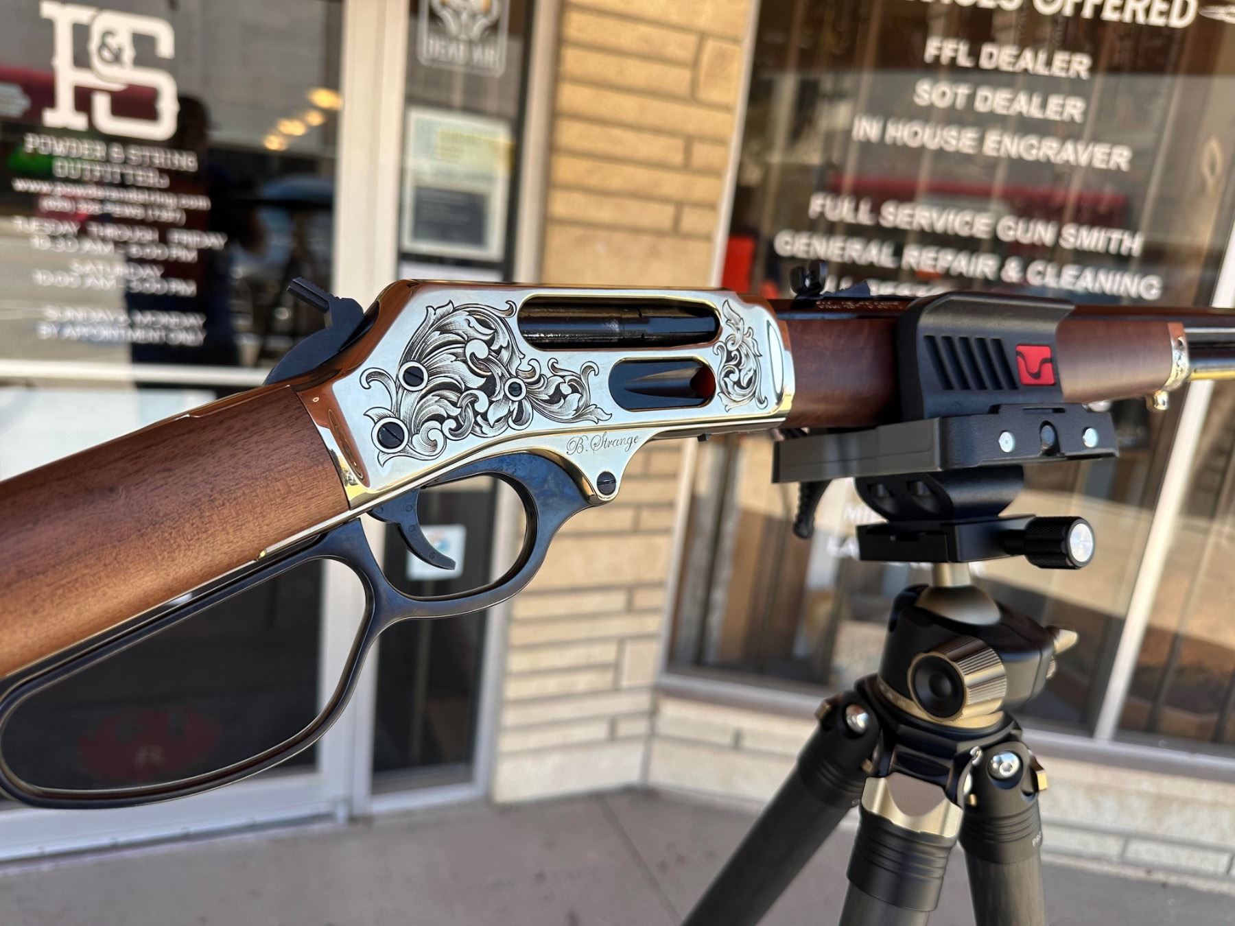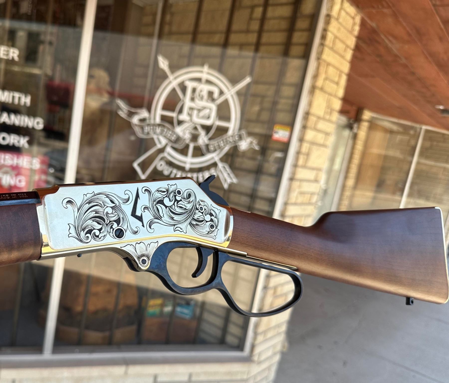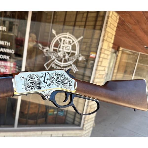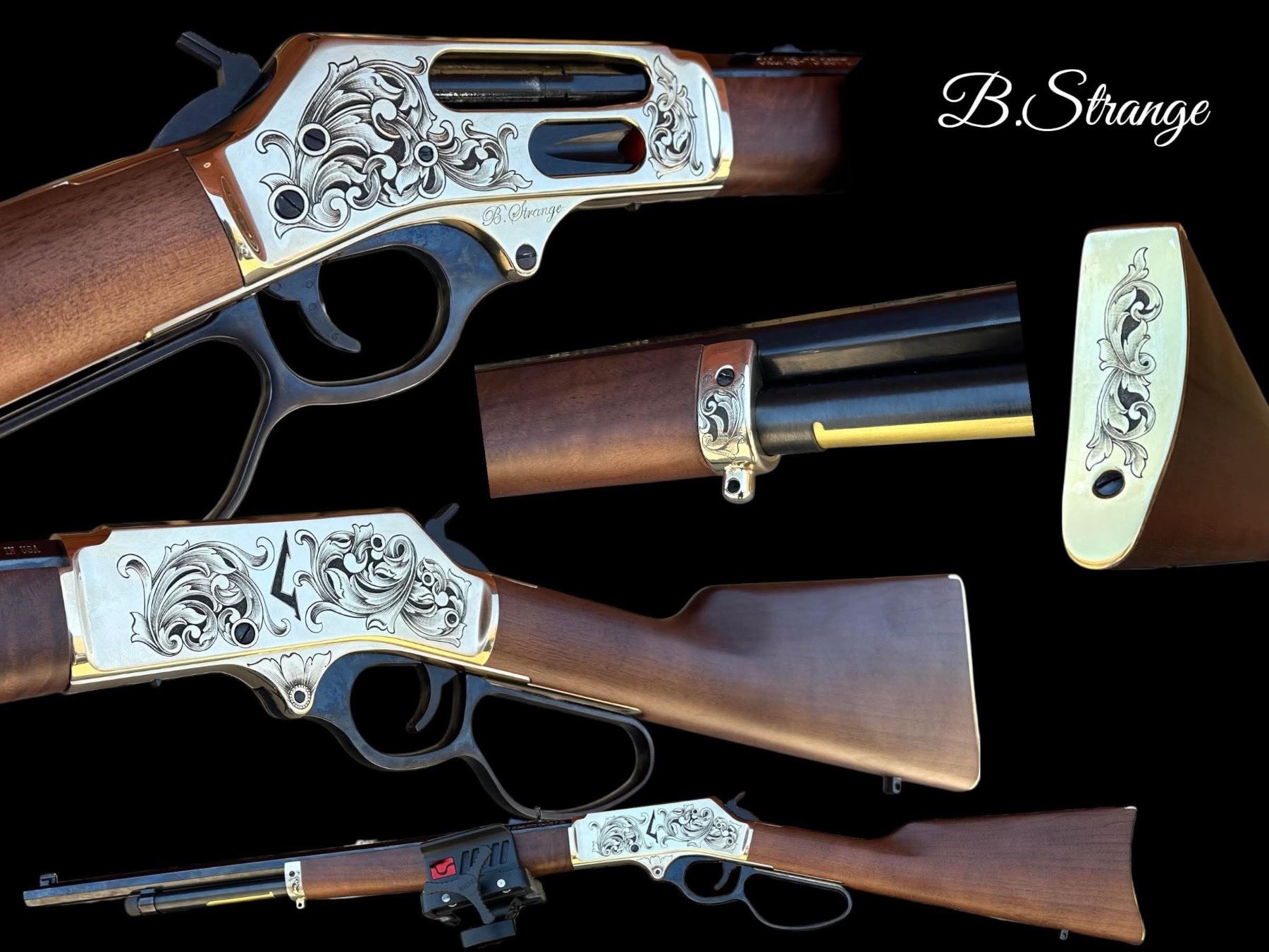 This is a one-of-a-kind Custom Engraved Henry Brass Lever Action .45-70. The Custom Hand Engraving was done by Brian Strange of Powder & String Outfitters located in Wellington, KS. As this rifle shows, Brian is a member of FEGA (Firearm Engravers Guild of America) & has been professionally engraving for over 15 years. The finished product is truly a one-of-a-kind Custom Firearm.