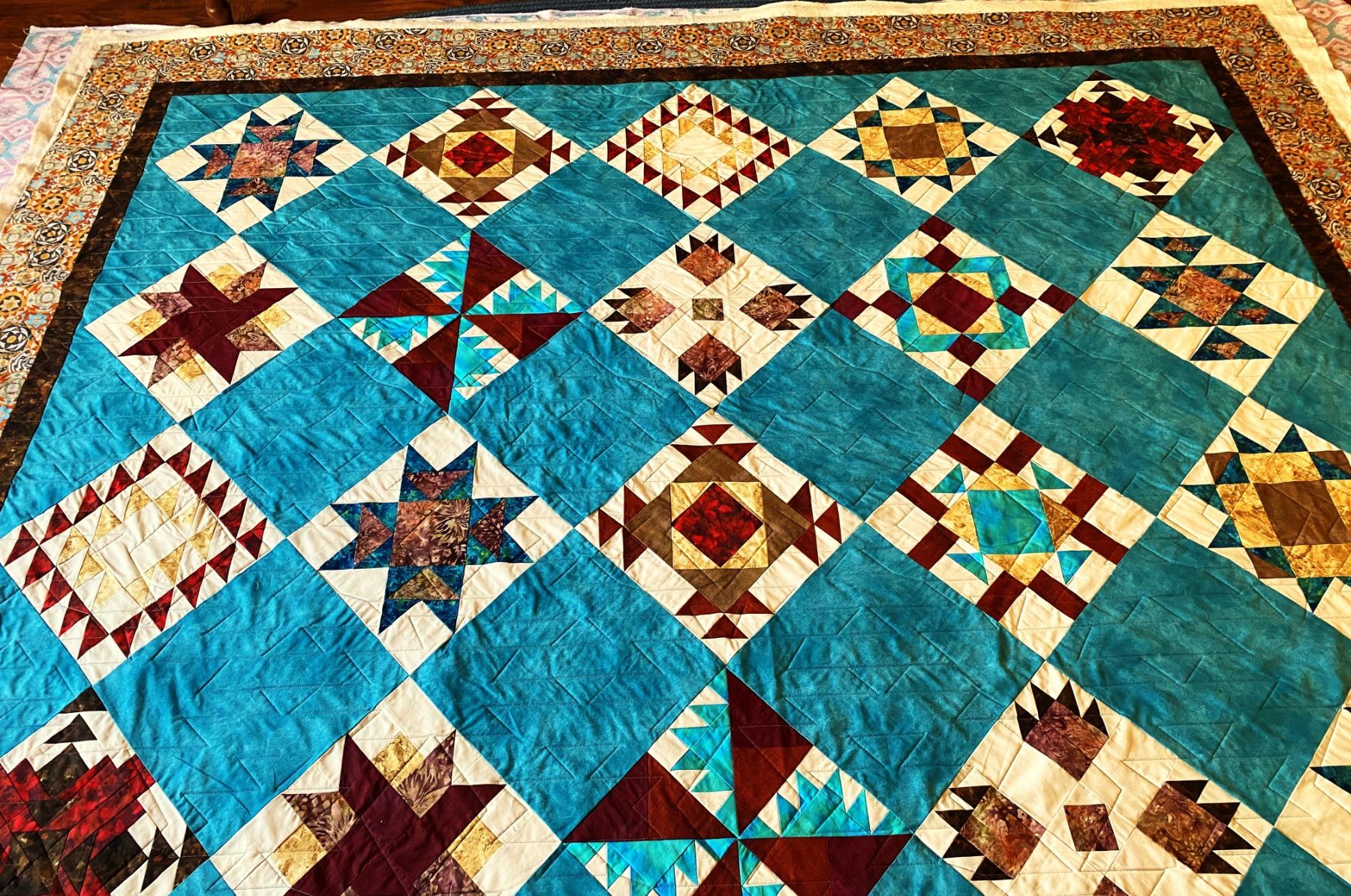 This “Spirit of Arizona” quilt is created by Annie Grace. It is designed to fit on a King-Sized bed and or Queen-Sized bed while allowing for overhang and pillow tuck. Its dimensions are 134” long x 101” wide which allows the buyer to use this beautiful quilt like a comforter if they wish. This quilt has 1,413 individually sewn pieces that took over 74 hours of combined machine/hand sewing to create. This is the only one of its kind, so don’t miss out.