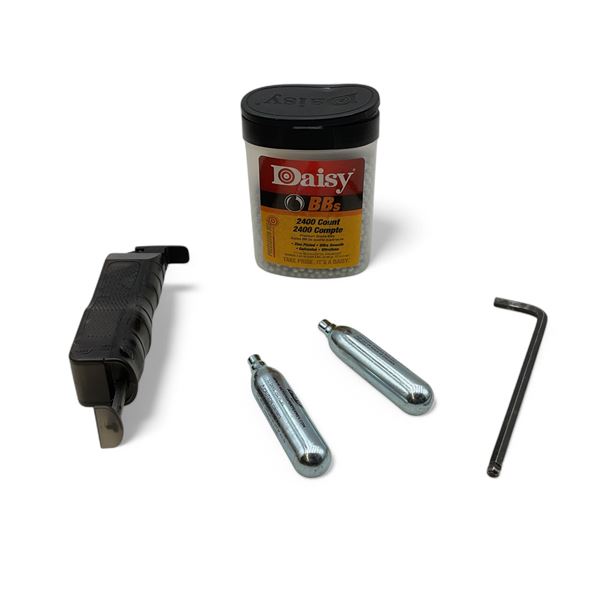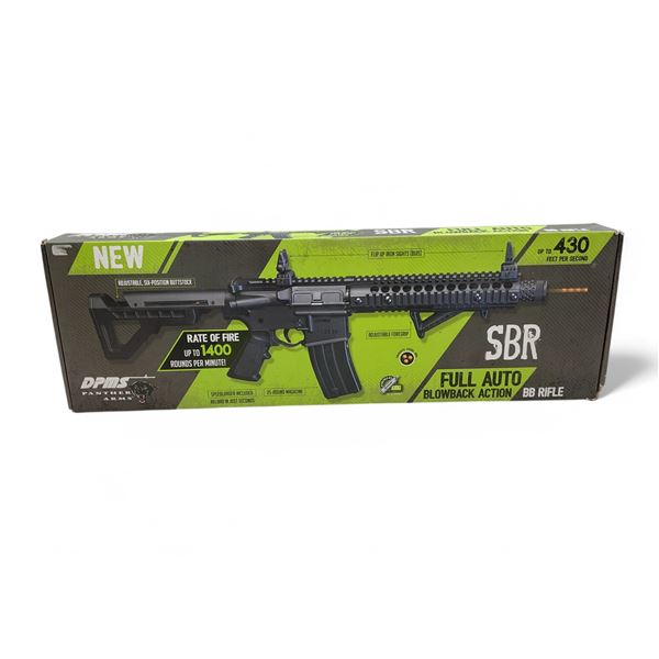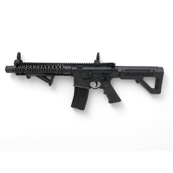 Crossman DPMS SBR Full Auto CO2 Blow Back .177 Caliber BB Rifle 430 FPS. Includes angled foregrip and one detachable magazine. Flip up sights; adjustable stock. Untested. You must be over 18 years of age to purchase this item.