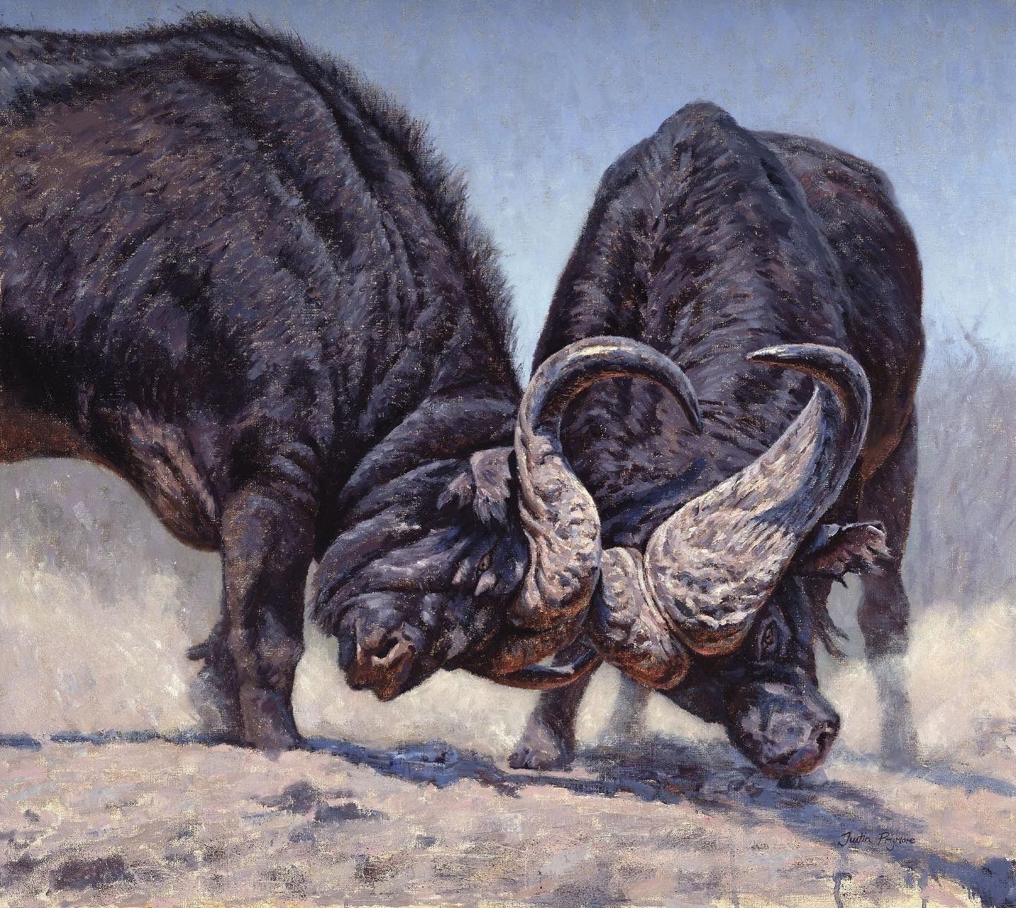 In "The Gladiators", British wildlife artist Justin Prigmore captures the raw, primal tension of a battle for dominance between two Cape Buffalo—majestic symbols of strength, unpredictability, and the untamed spirit of Africa. This large-scale oil painting stands as a powerful tribute to the dramatic moments that define life in the wild.