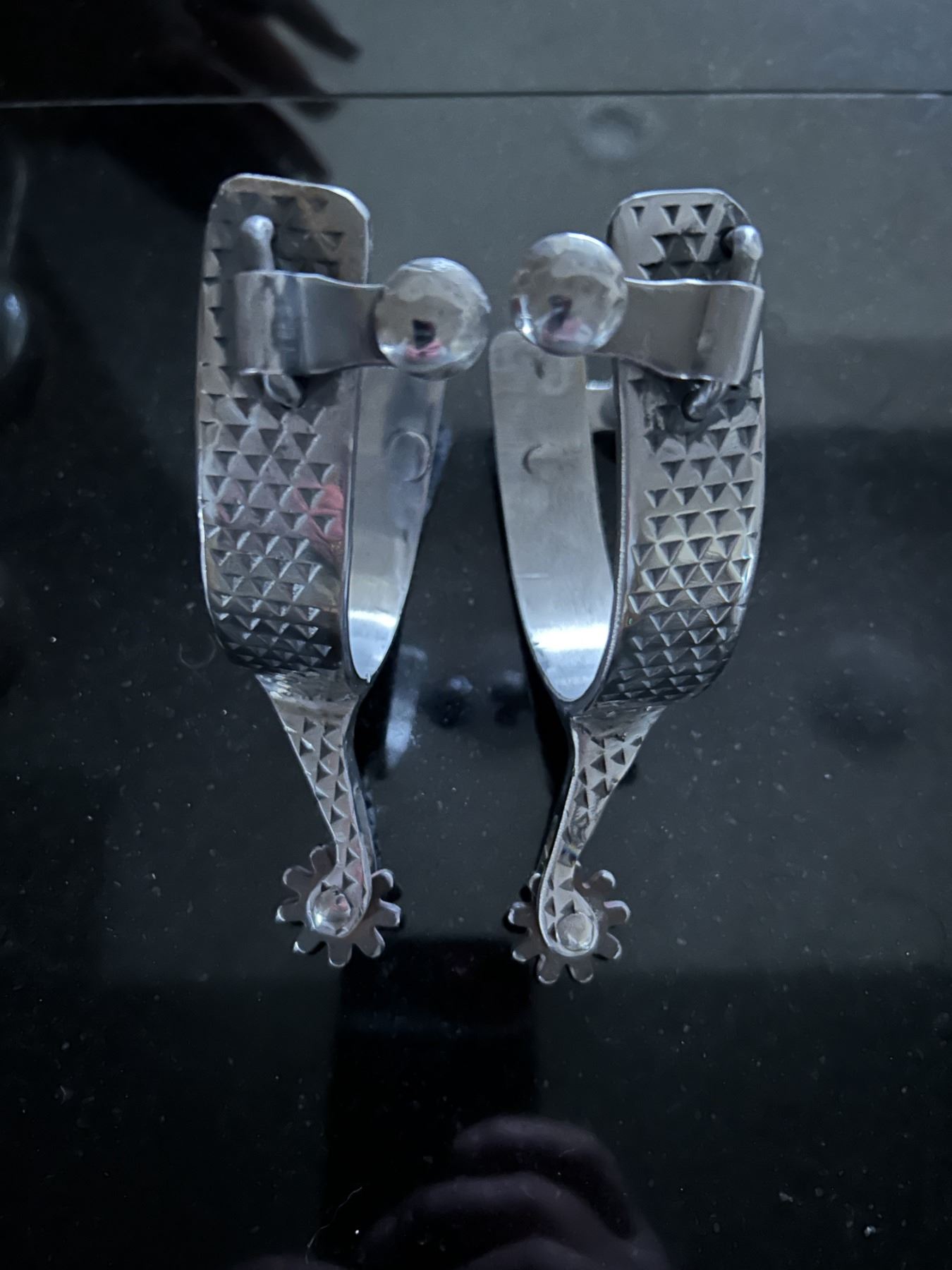 KEY ITEM: Ride em cowboy. Hand made rasp spurs. These spurs are made from horse shoeing rasps by Lyle Wilde of Arizona a long time supporter of Safari Club International.