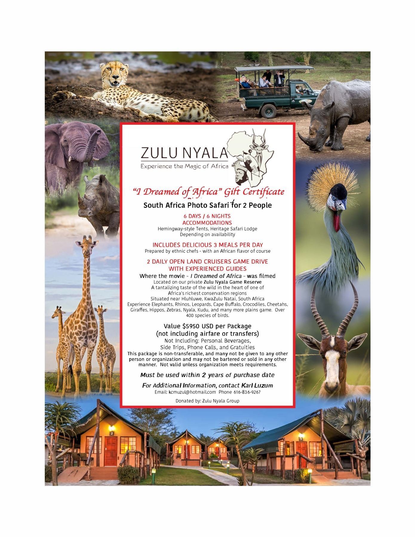 This Photo Safari auction package is non-transferable without written authorization from Zulu Nyala and is non- refundable.