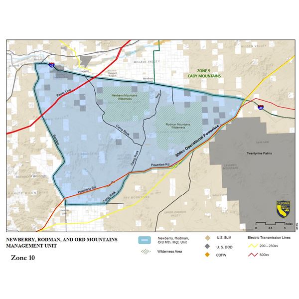 The Newberry, Rodman, and Ord Mountains (Zone 10) hunt unit is located east of Barstow and south of Interstate 40 (see hunt zone map attached). Established in 2019, it is the newest hunt zone in California.